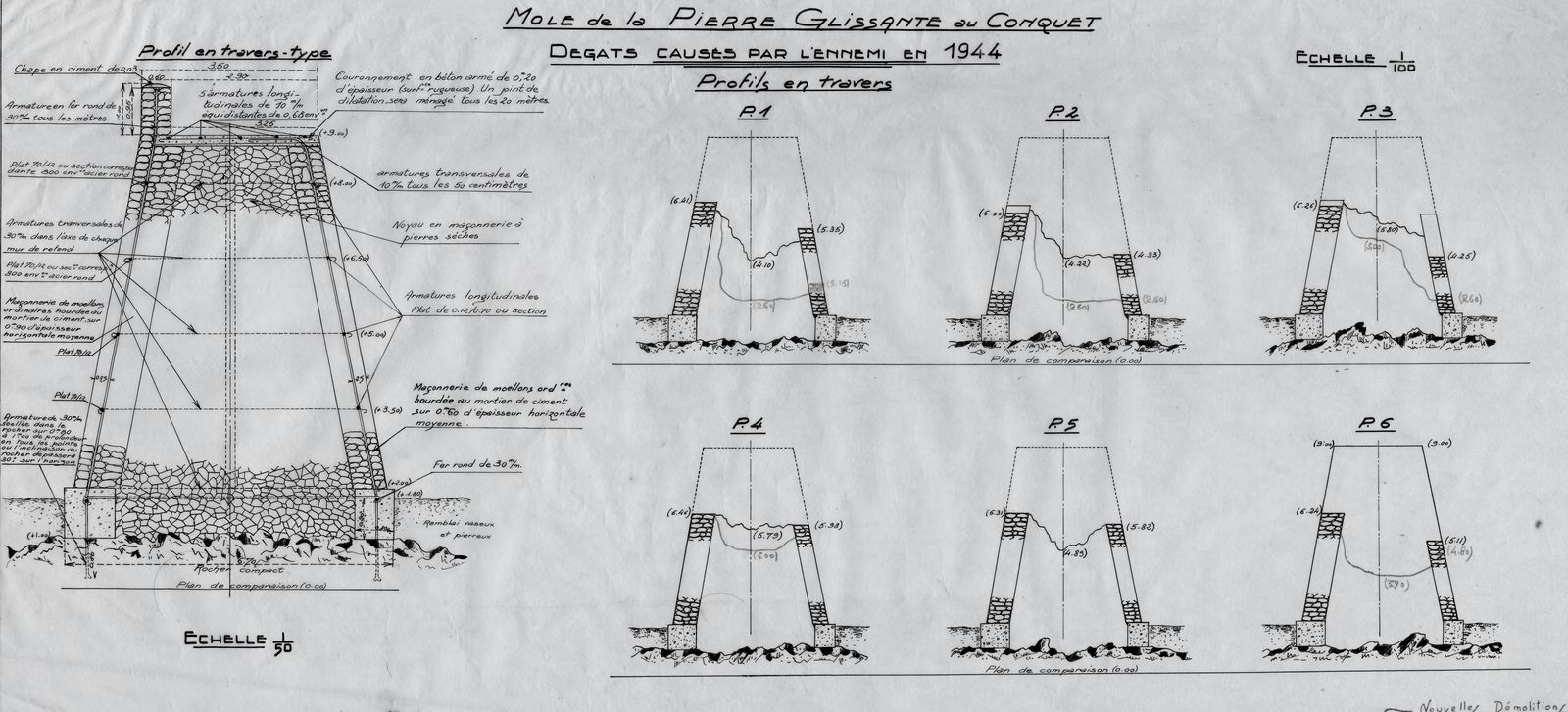 Môle de la pierre-glissante, dégâts causés par l'ennemi en 1944, profil en travers (non daté ; vers 1948)Immatriculation