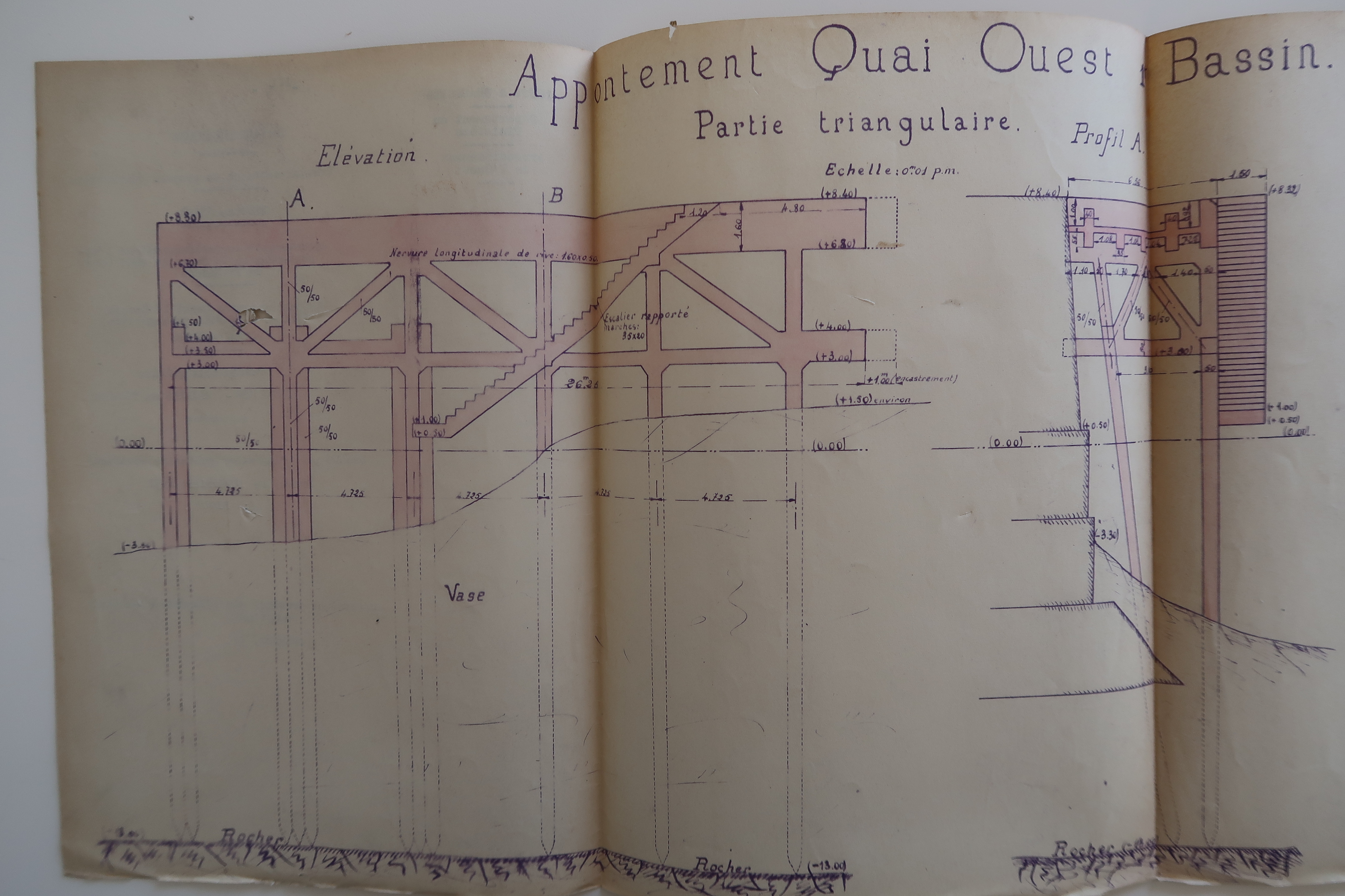 Elévation et profil en travers du projet d'appontement en prolongement de l'appontement de la Santé au quai ouest du 1er bassin, 10/02/1931Immatriculation