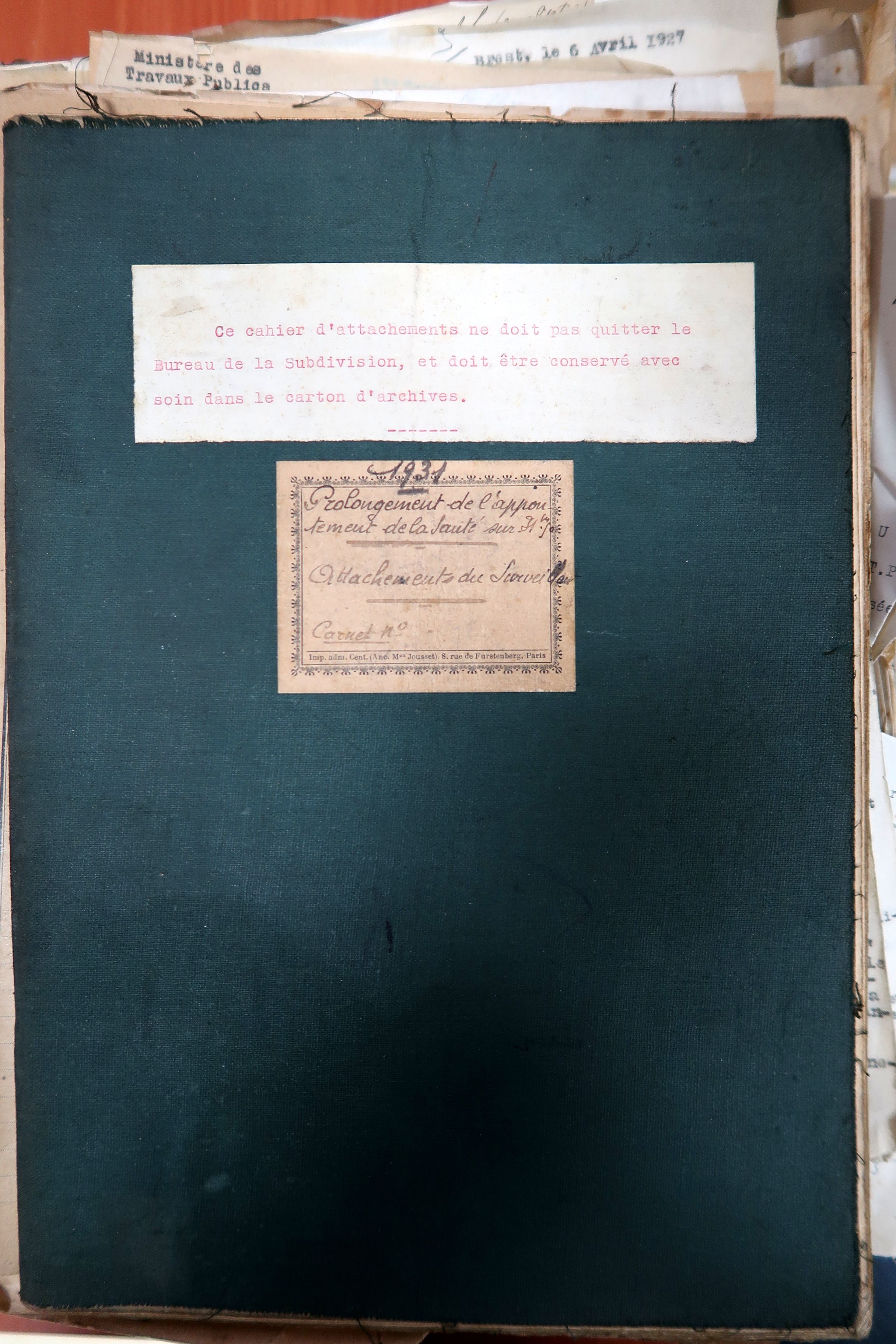 Cahier d'attachements : prolongement de l'appontement de la Santé (1931)Immatriculation