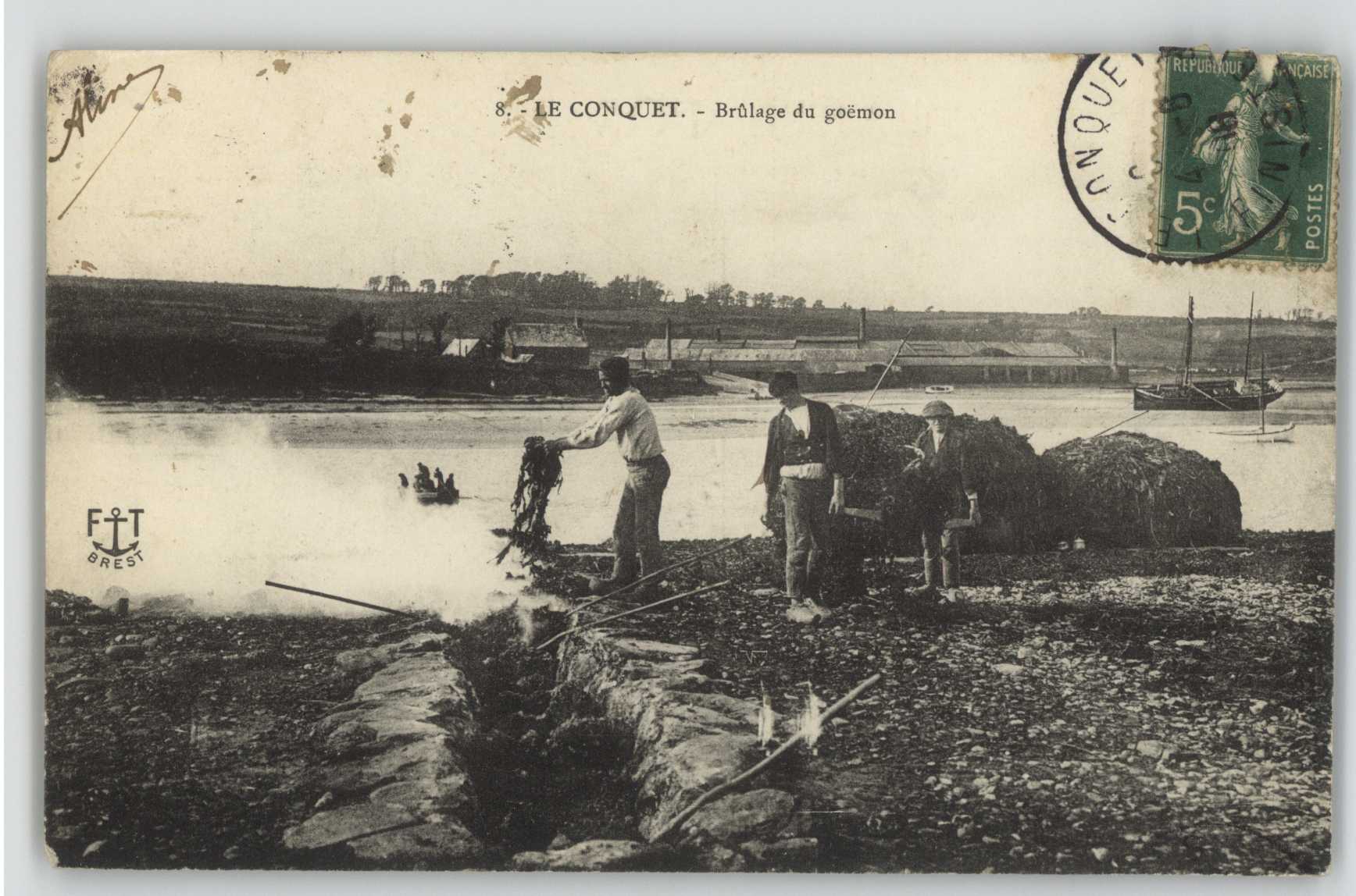 Carte postale, Le Conquet, brûlage de goémon, ed. FT Brest (usine Tissier en arrière-plan)Immatriculation