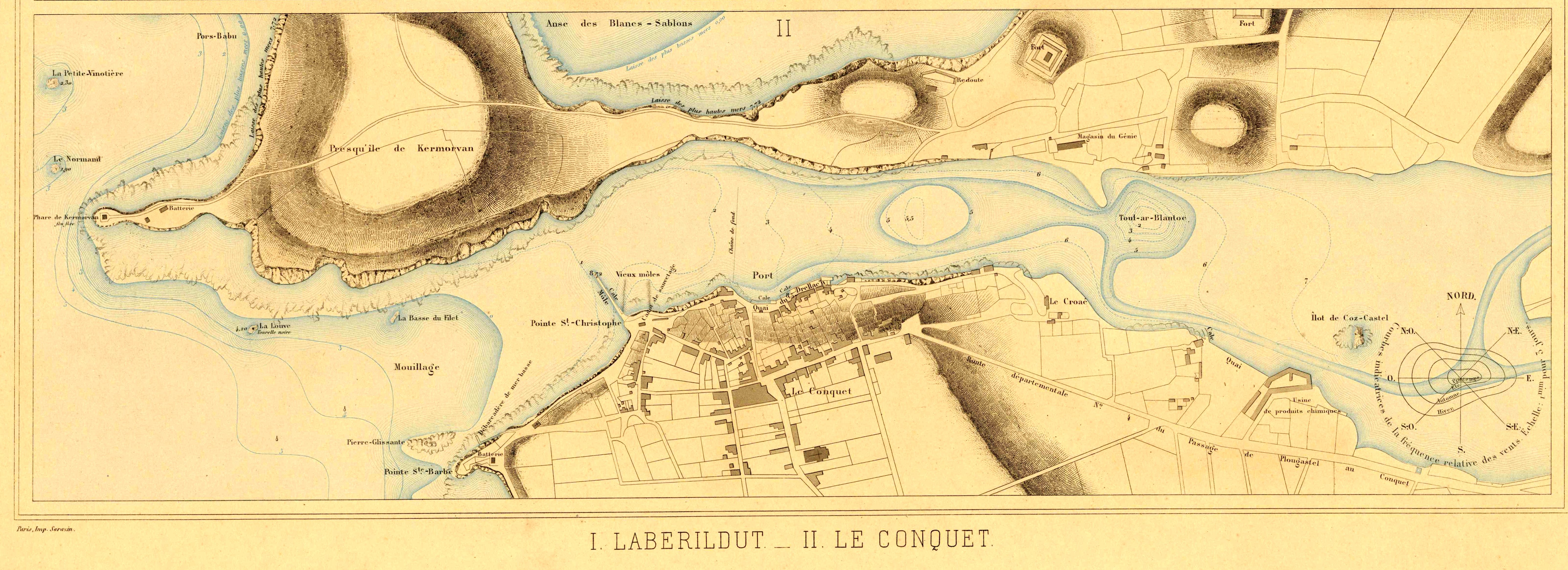 Pl. 54. Atlas des ports de France. I-Laberildut. II-Le Conquet. Paris Imp. Sarazin 1879