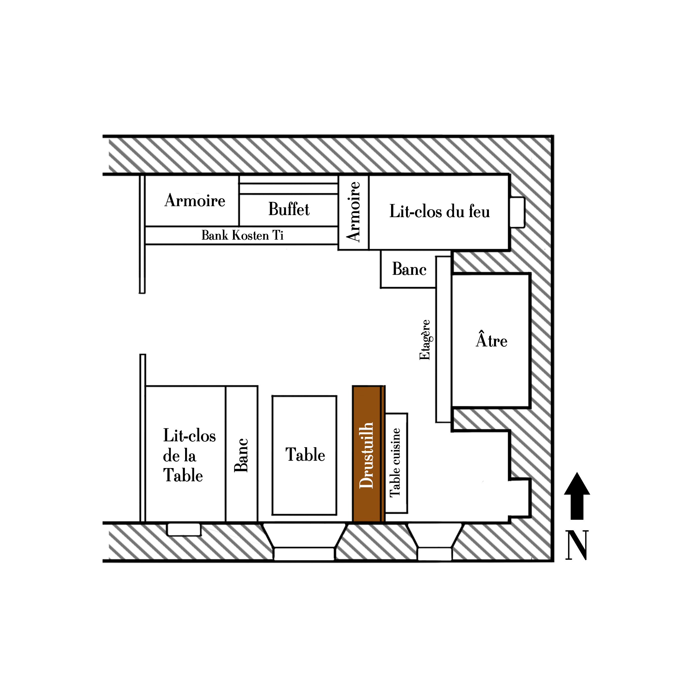 Emplacement du drustuilh dans la salle commune.Immatriculation