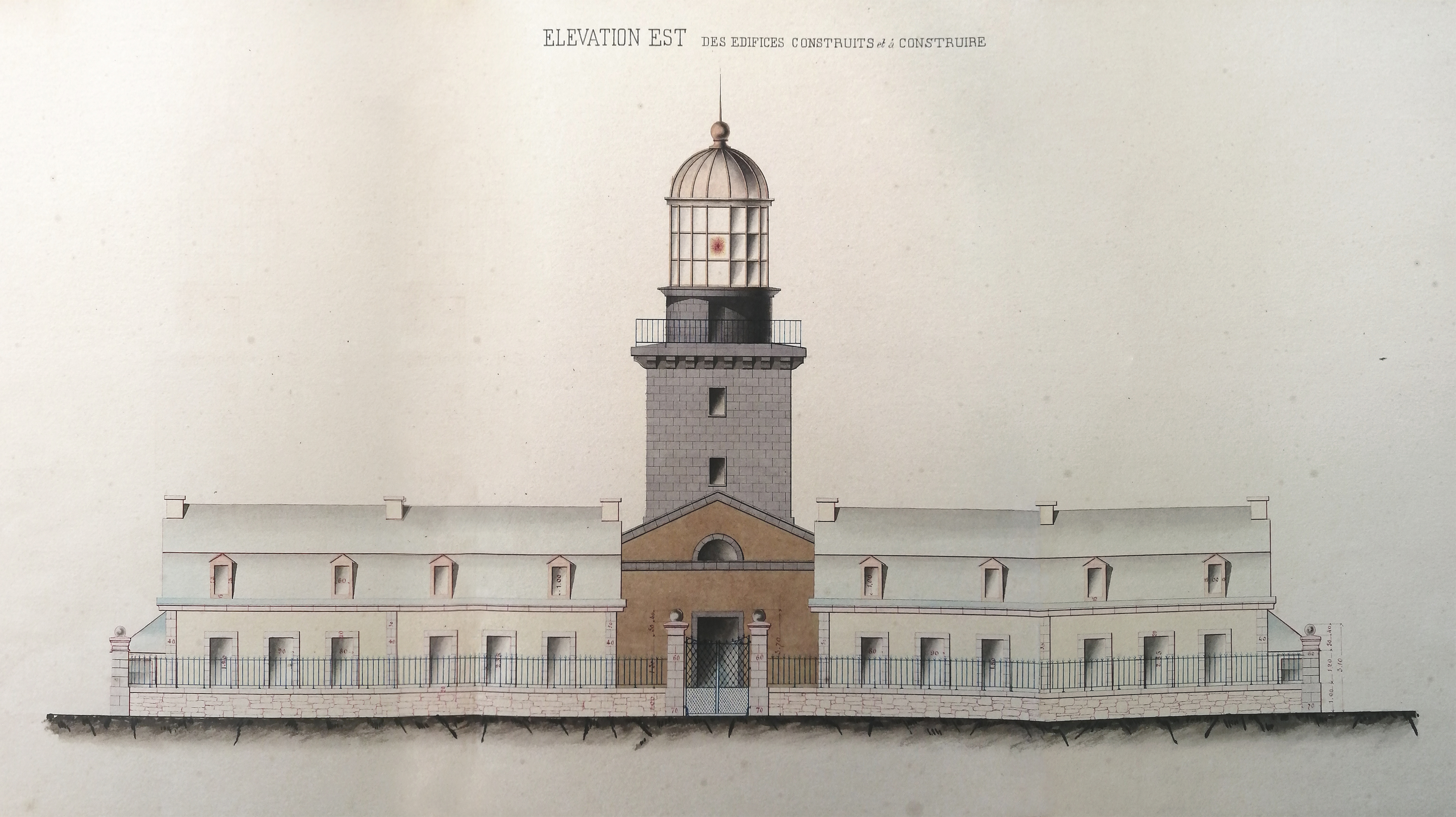 Elévation est du phare et des logements des gardiens. Reproduction d'un plan des Ponts et Chaussées, 1880.Immatriculation