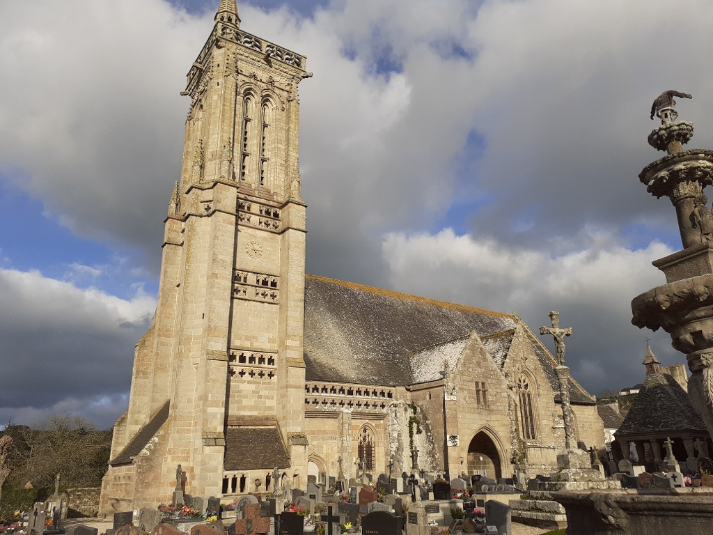 Vue depuis le sud-ouest avec le clocher, les ossuaires d'attache, le porche sud, la croix de cimetière et l'oratoireImmatriculation