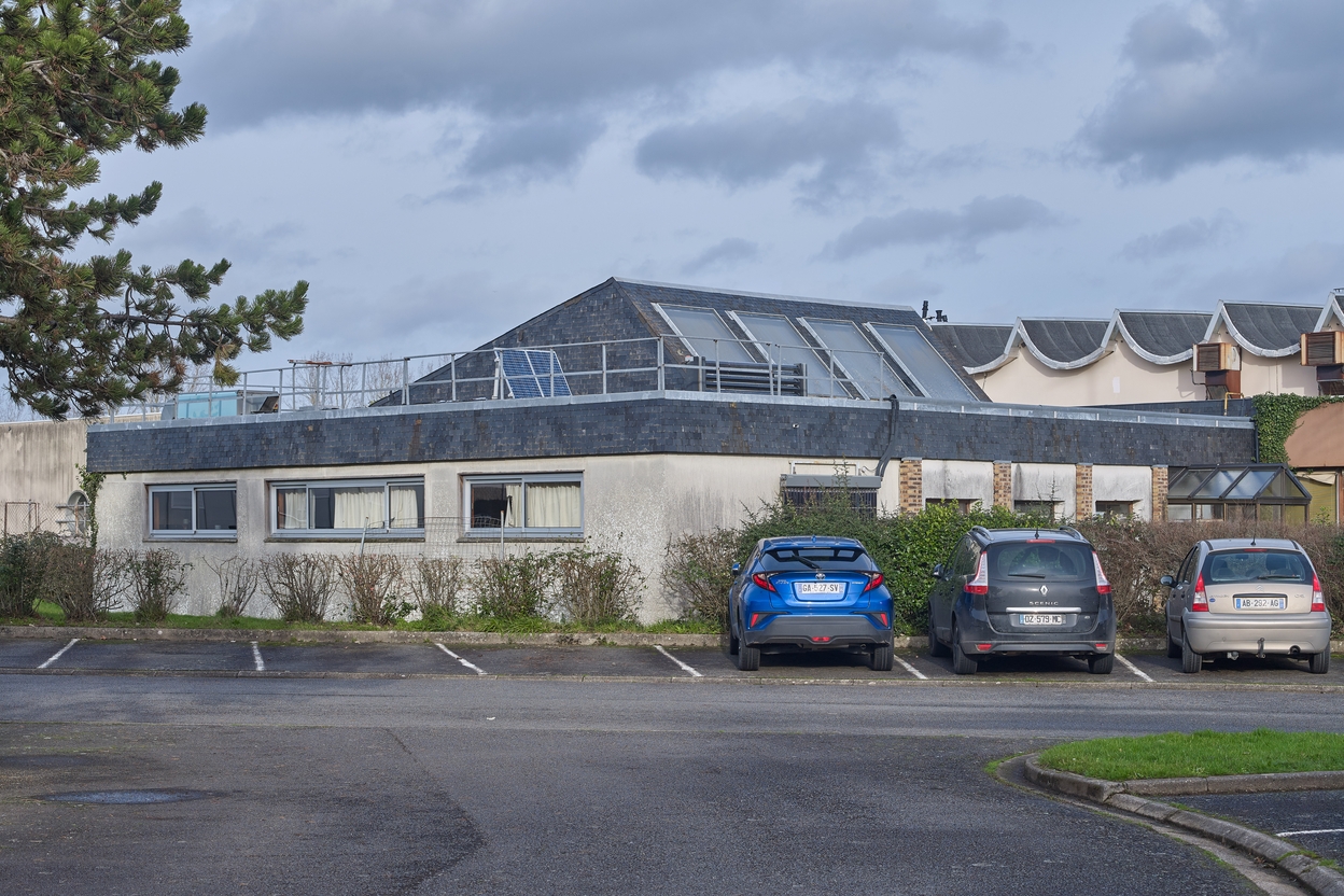 Vue d'ensemble partielle prise du sud-ouest du "Labo BTS", accolé à la façade ouest des ateliers. Une architecture qui veut allier modernité et régionalisme.Immatriculation