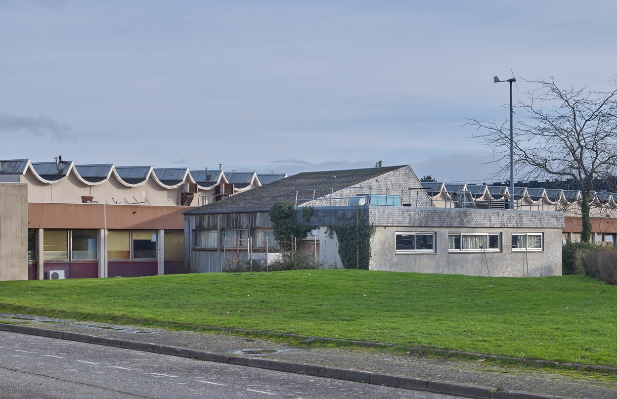 Vue d'ensemble partielle prise du nord-ouest du "Labo BTS", accolé à la façade ouest des ateliers. Une architecture qui veut allier modernité et régionalisme.Immatriculation