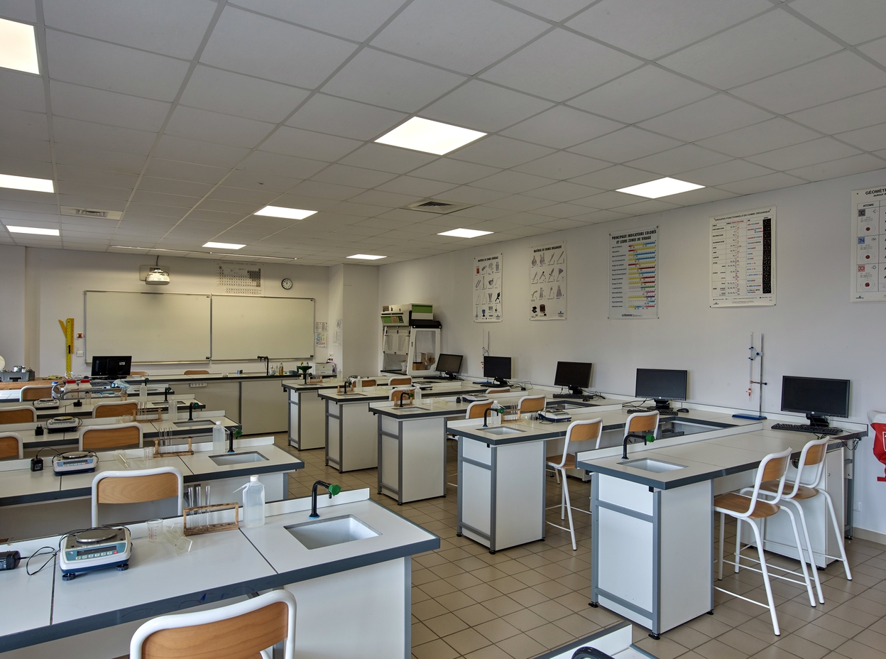 Vue d'ensemble d'une salle de classe spécialisée : chimie (bâtiment D).Immatriculation