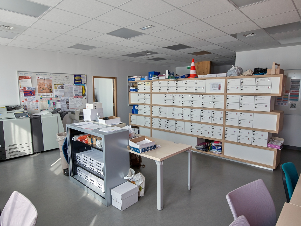 Salle des professeurs.es : meuble boites aux lettres. Pierre Brulé, architecte, 2017.Immatriculation