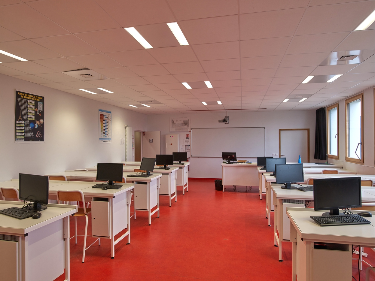 Salle de classe spécialisée dans le bâtiment A. Pierre Brulé, architecte, 2017.Immatriculation
