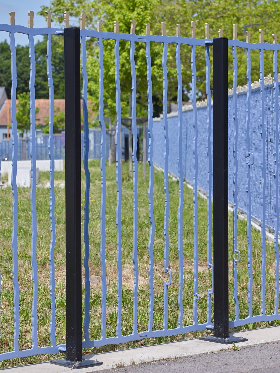Creatura, clôture réalisée dans la commande publique artistique de la ligne B du métro. Valentin Carron, 2021. Vue de détail.Immatriculation