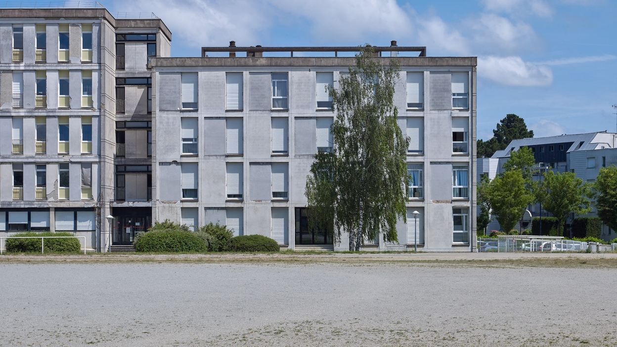 Façade ouest de l'internat de garçons : aile sud abritant les logements. Noter la cage d'escalier vitrée à l'articulation avec les chambres des élèves. Louis Arretche et Jean Lemercier, architectes, 1967Immatriculation