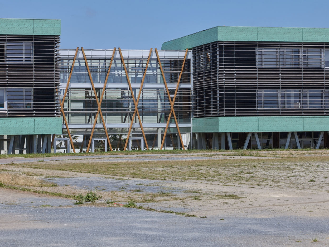 Vue partielle de la façade sud de l'espace sciences (bâtiments B2 et B3), centrée sur la galerie vitrée. Thierry Soquet, architecte, 2015.Immatriculation