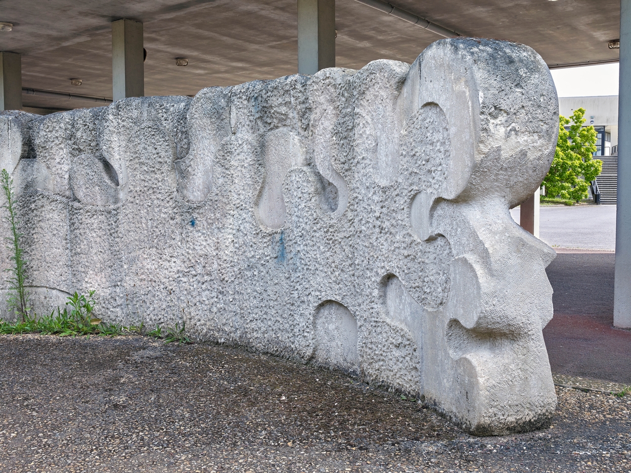 Sculpture de Yazuo Mizui (1976), en pierre de Vassens : vue partielle de l'un des deux murs.Immatriculation