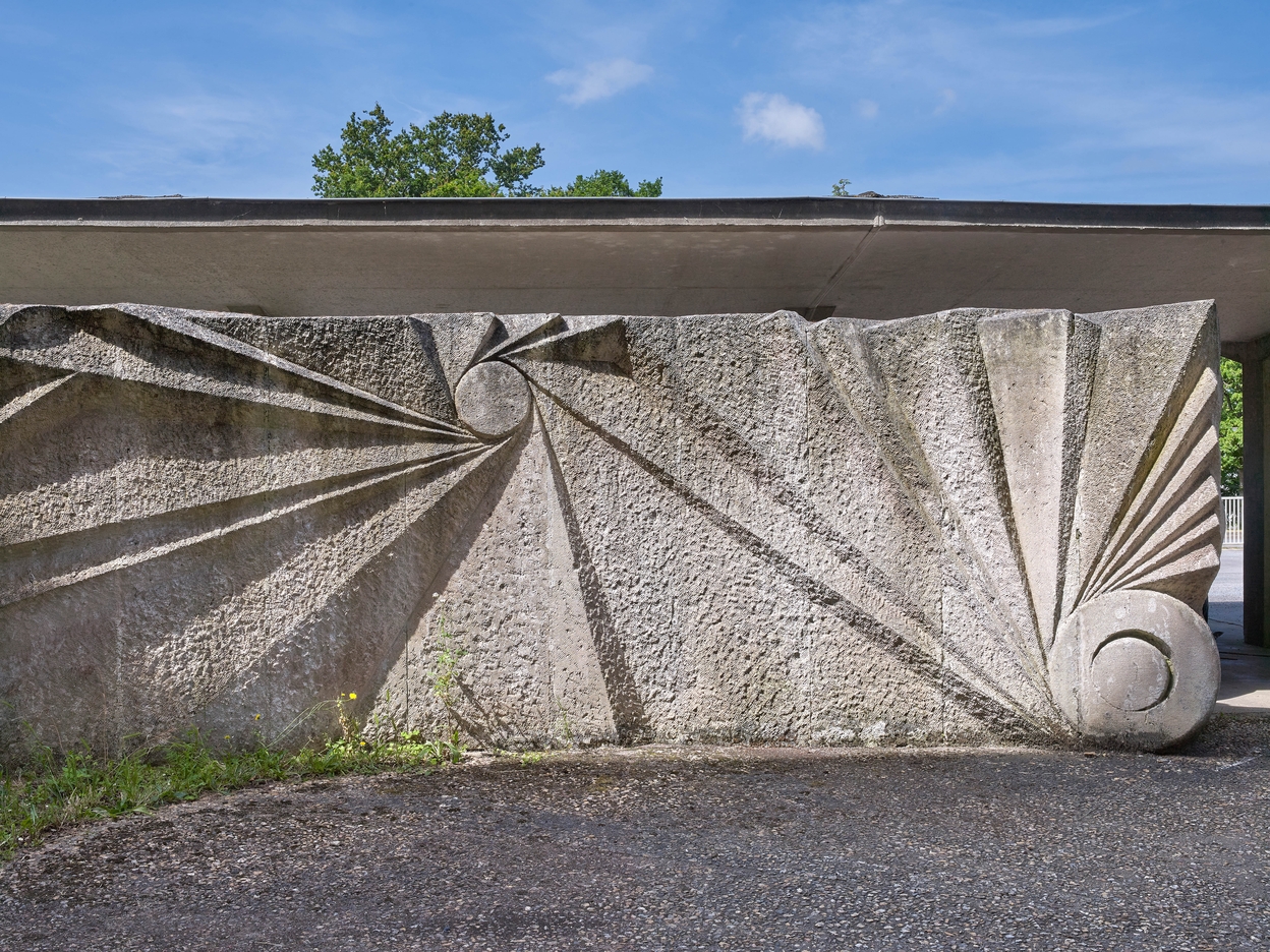 Sculpture de Yazuo Mizui (1976), en pierre de Vassens : vue partielle de l'un des deux murs.Immatriculation