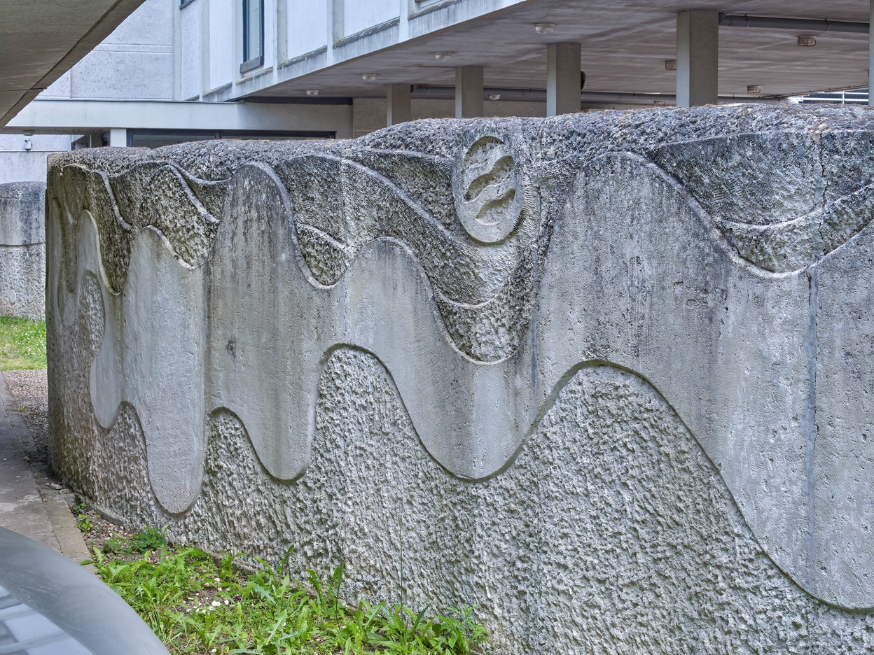 Sculpture de Yazuo Mizui (1976), en pierre de Vassens : vue partielle de l'un des deux murs.Immatriculation