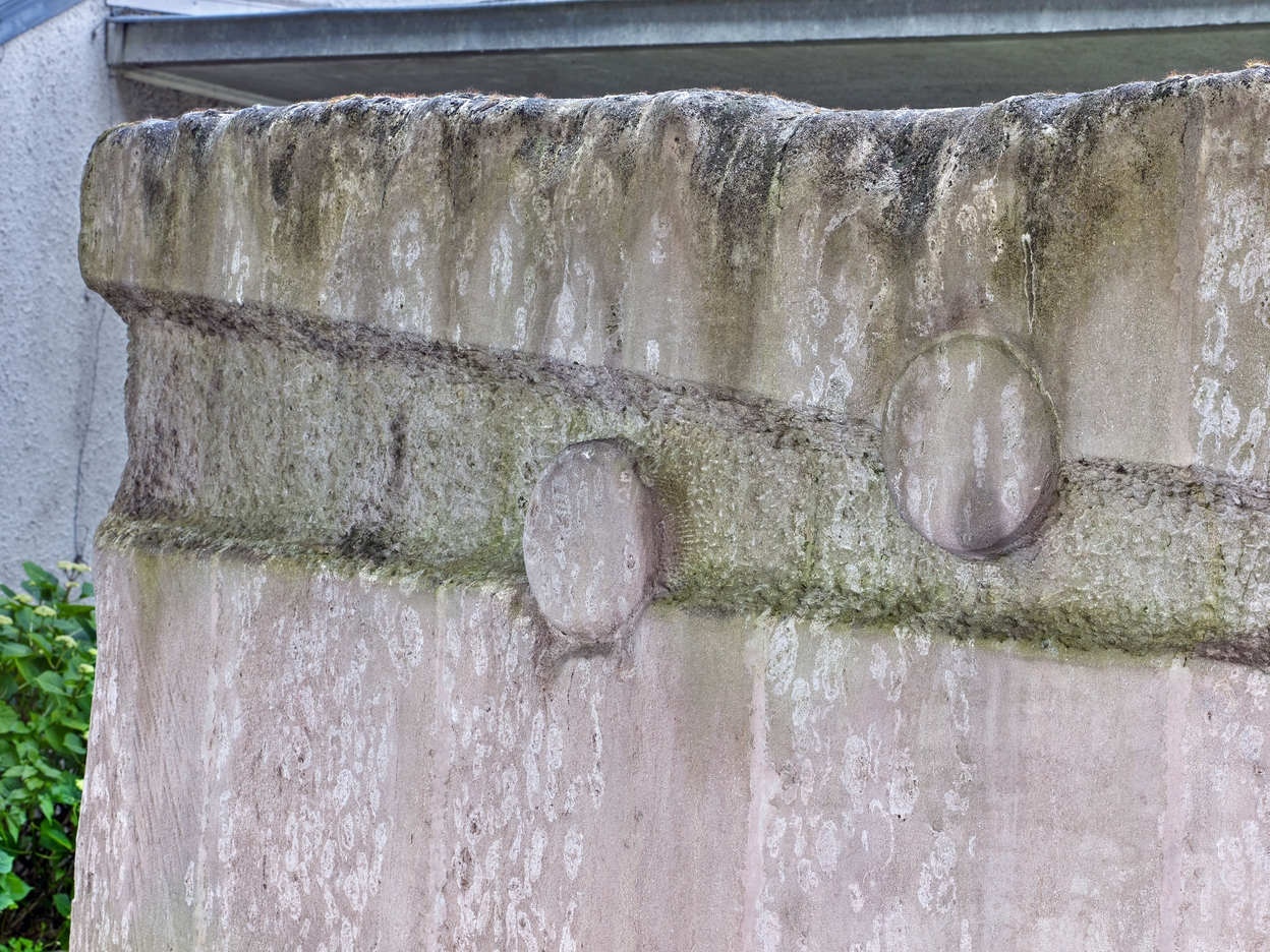 Sculpture de Yazuo Mizui (1976), en pierre de Vassens : détail.Immatriculation