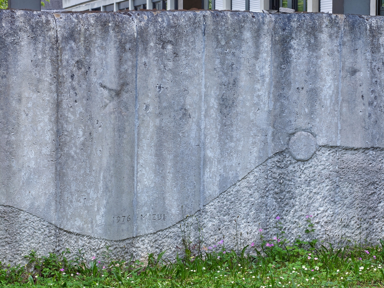 Sculpture de Yazuo Mizui (1976), en pierre de Vassens : vue partielle de l'un des deux murs comprenant la signature.Immatriculation