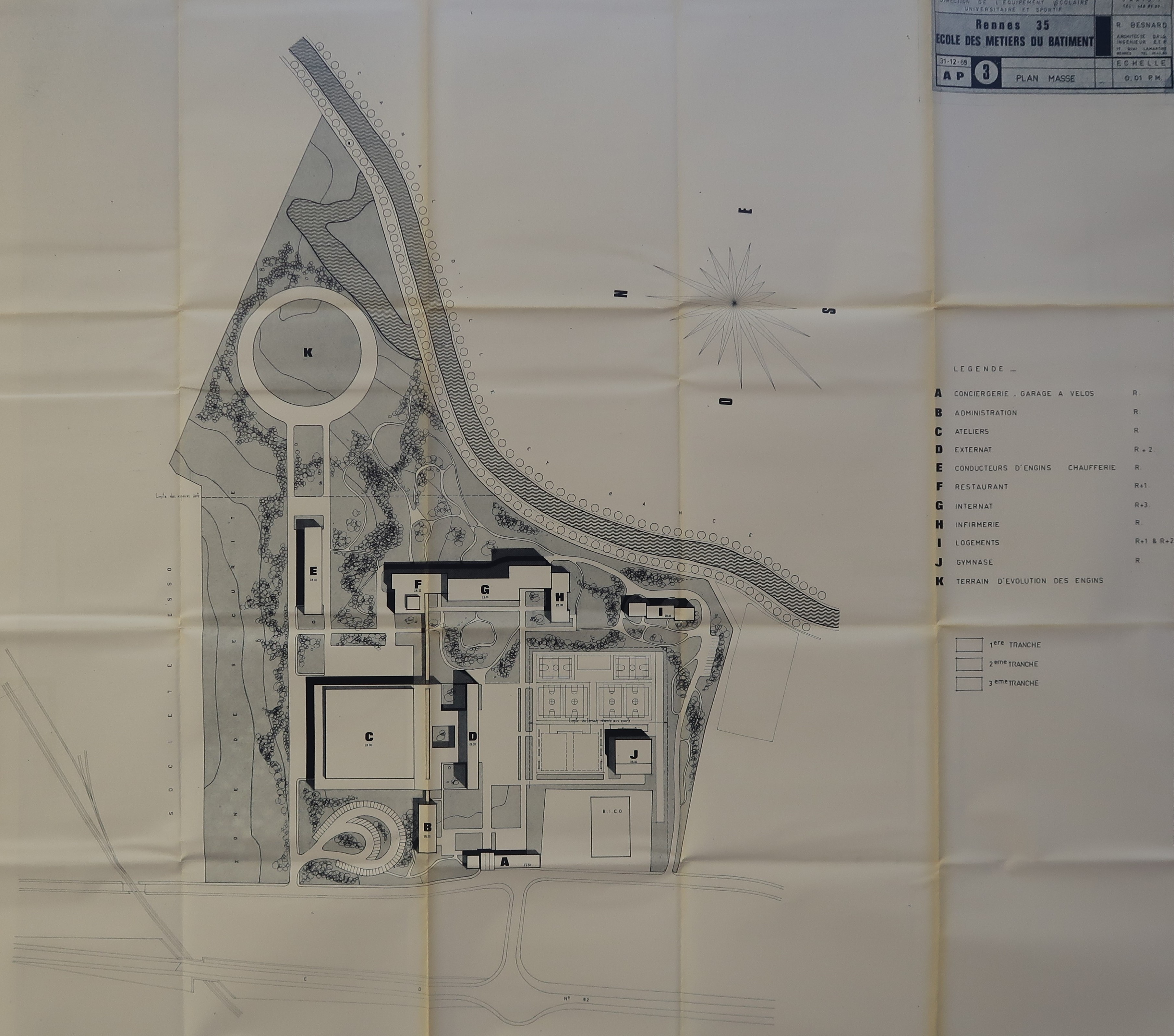 Archives municipales de Rennes : 646 W 72. Besnard [Roger], Jeu de plans de l'Ecole des métiers du bâtiment, 1969.