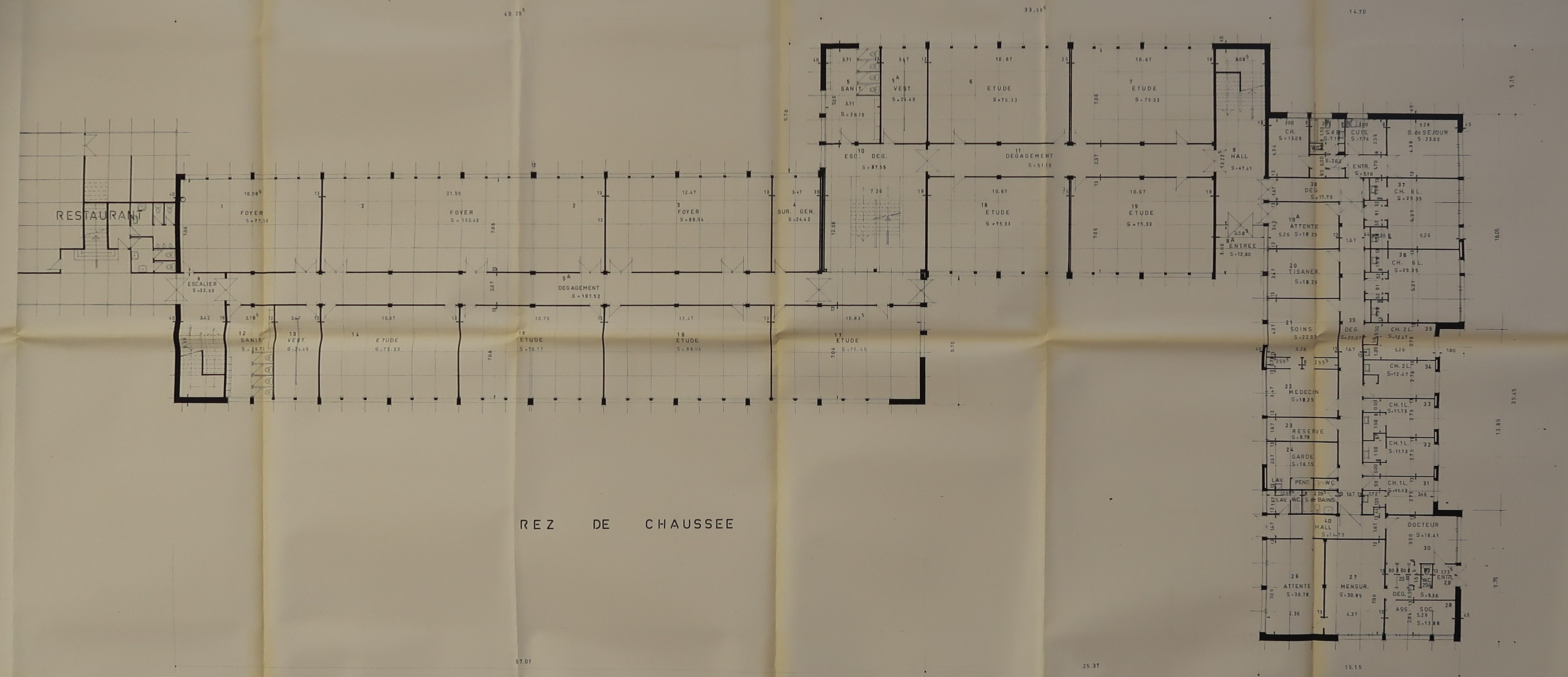 Internat et infirmerie, plan du rez-de-chaussée. Roger Besnard, architecte, 1969.Immatriculation