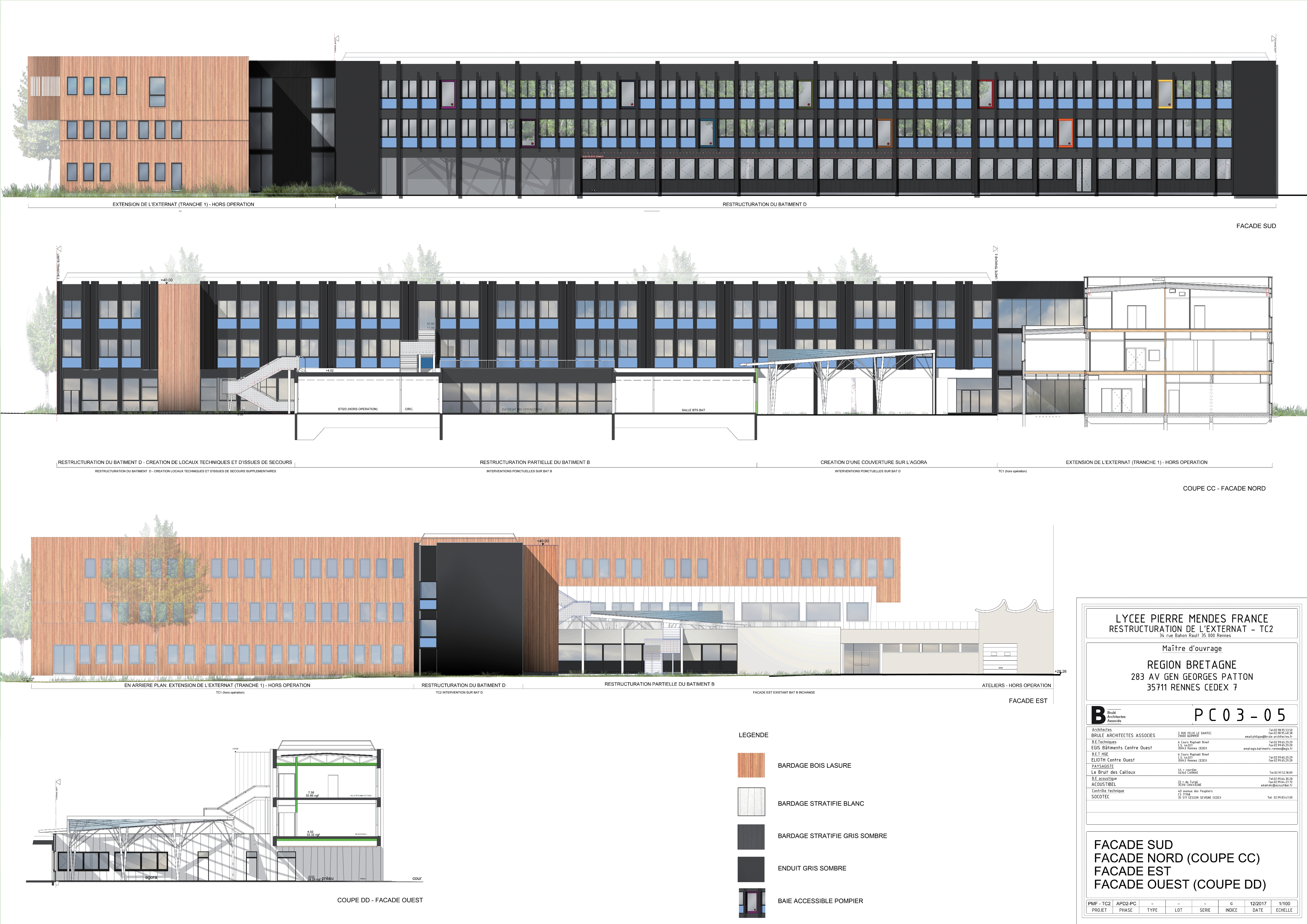 Elévations des façades et coupes du l'externat restructuré. Pierre Brulé, architecte, 2017.Immatriculation