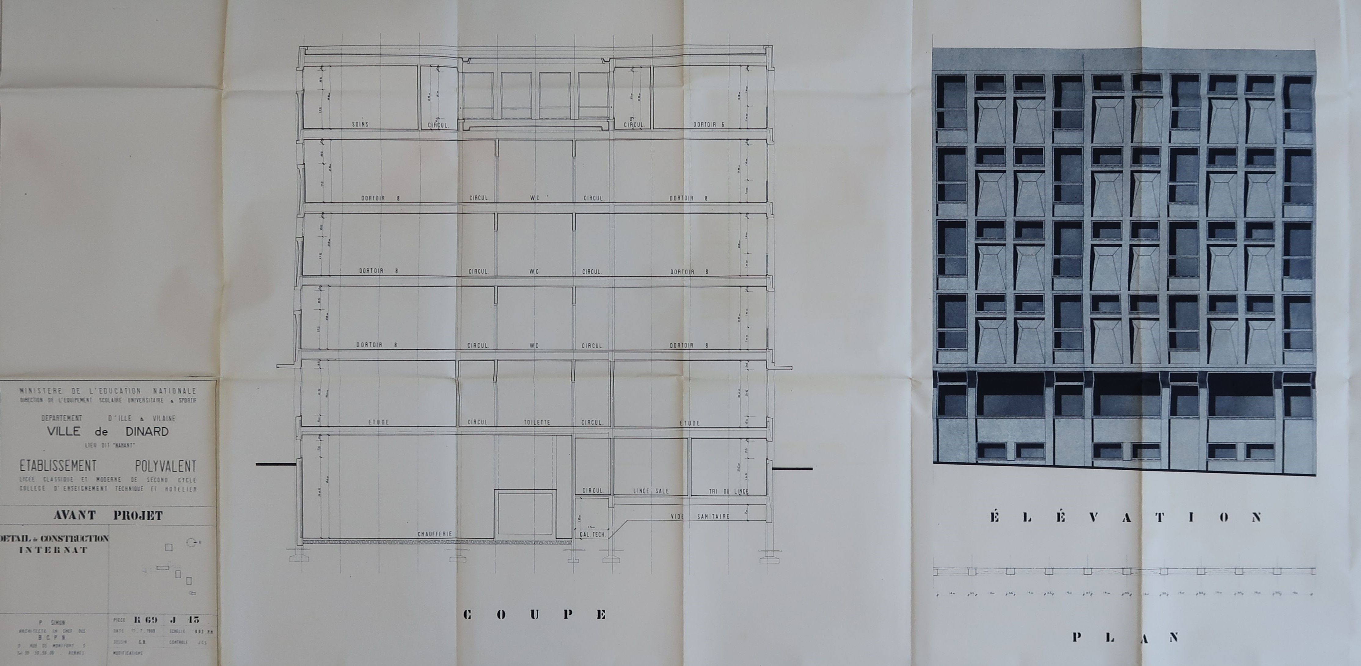 Elévation et coupe des façades des internats (Patrice Simon, architecte, 17 juillet 1969) : animation de la trame par variation des hauteurs des fenêtres et allèges.Immatriculation
