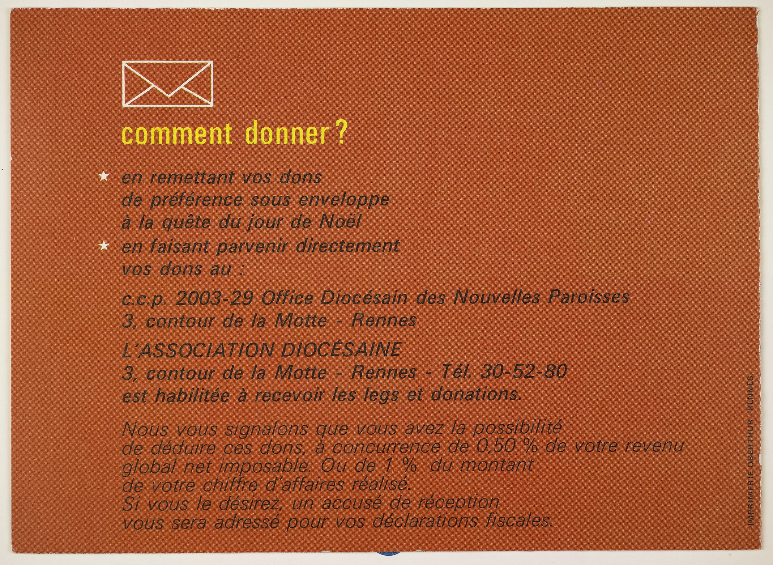 Feuillet de l'office diocésain des nouvelles paroisses encourageant aux dons, vers 1969. Coll. Musée de BretagneImmatriculation