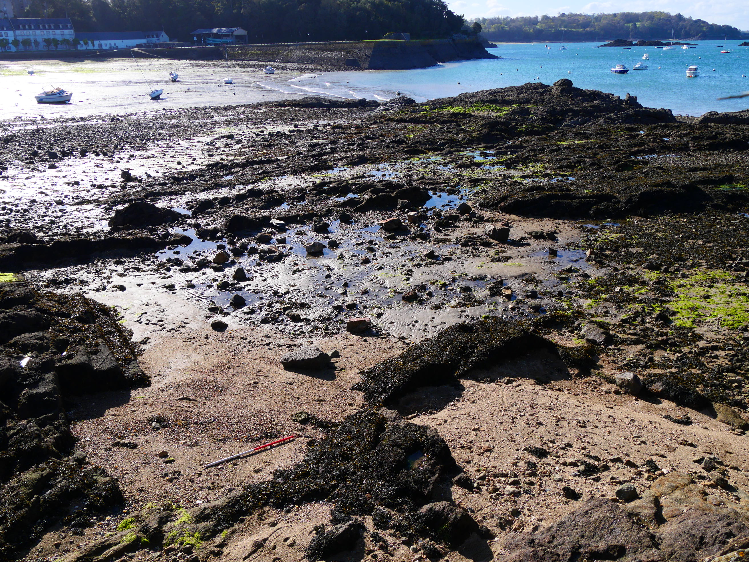 Vue d'ensemble, à marée basse, des deux bassins romains actuellement comblés de sableImmatriculation