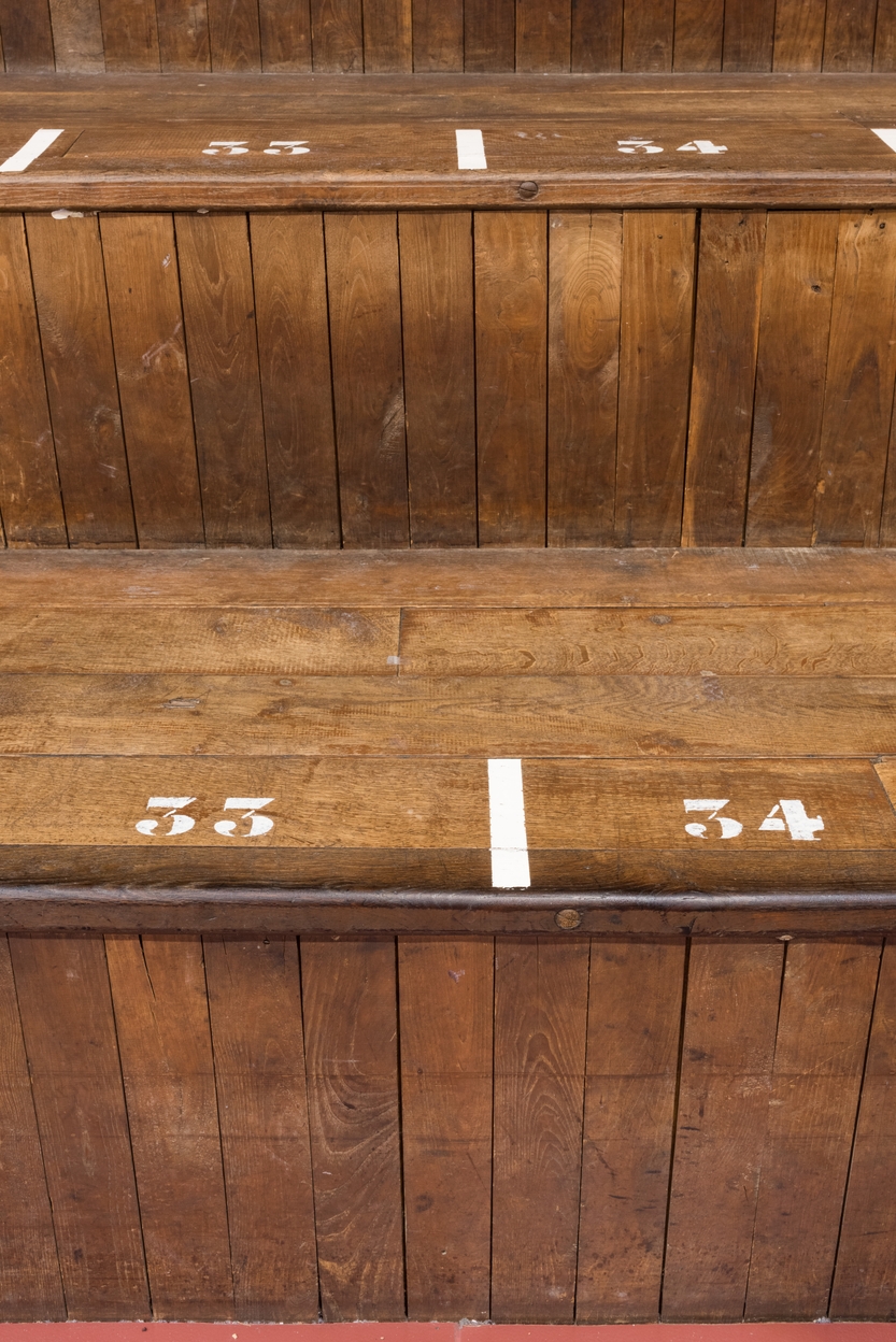 Gradins en bois, les sièges y sont numérotés à la peinture blancheImmatriculation