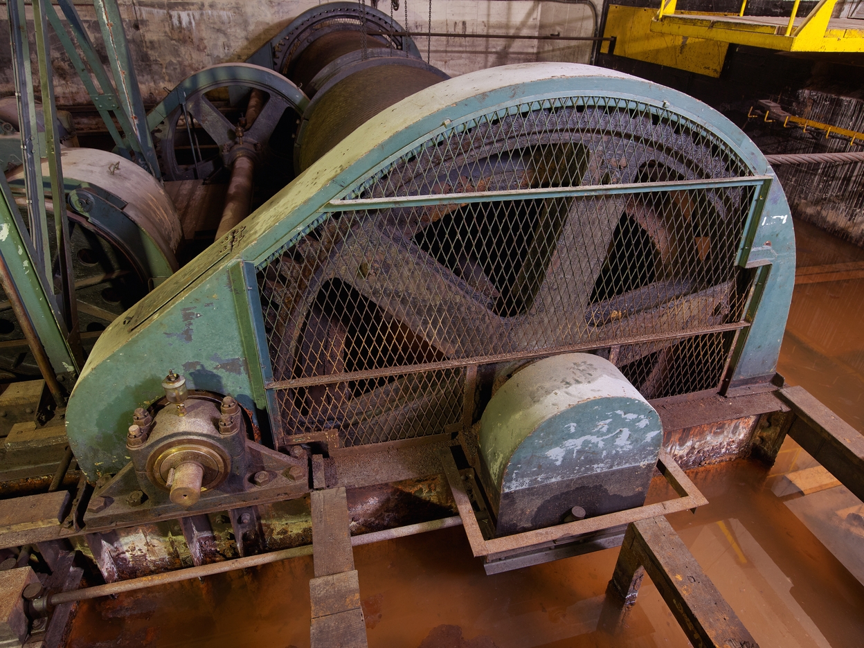 Vue des engrenages sous carter de protection des grands tambours pour les câbles de hissage du charriot du slipway. La salle est inondée (état en janvier 2023)Immatriculation