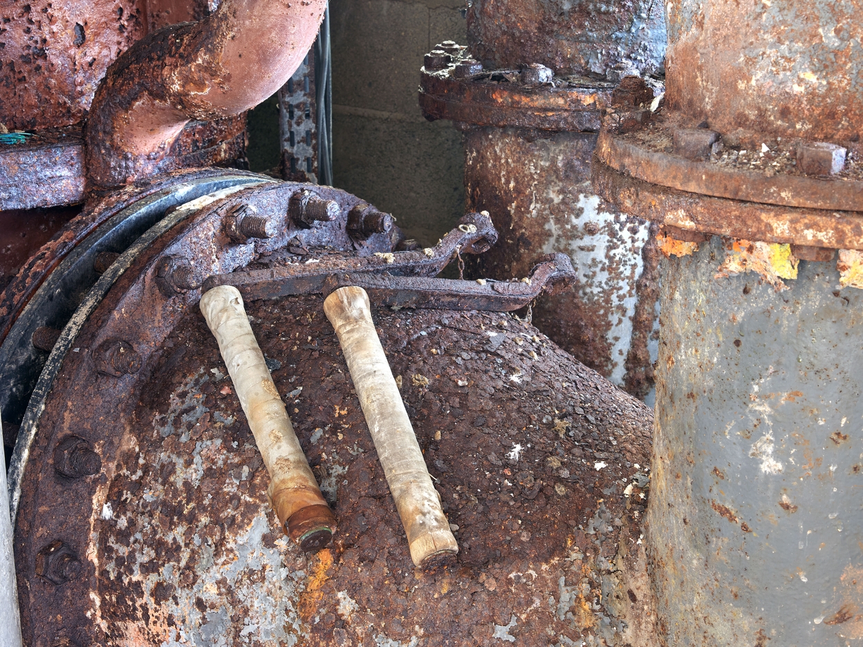 Vue de détail du corps/tuyau de pompe du bassin G. Deux manivelles sont posées sur le tuyau de pompeImmatriculation