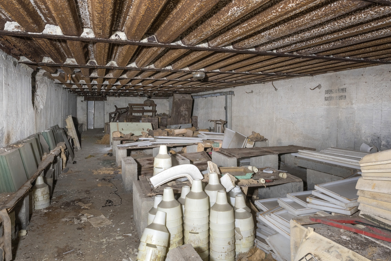 Vue de l'une des deux salles (1) : rangées de bancs en béton surmontés de leurs assises en bois. Au fond de la salle, empilement de sommiers en boisImmatriculation