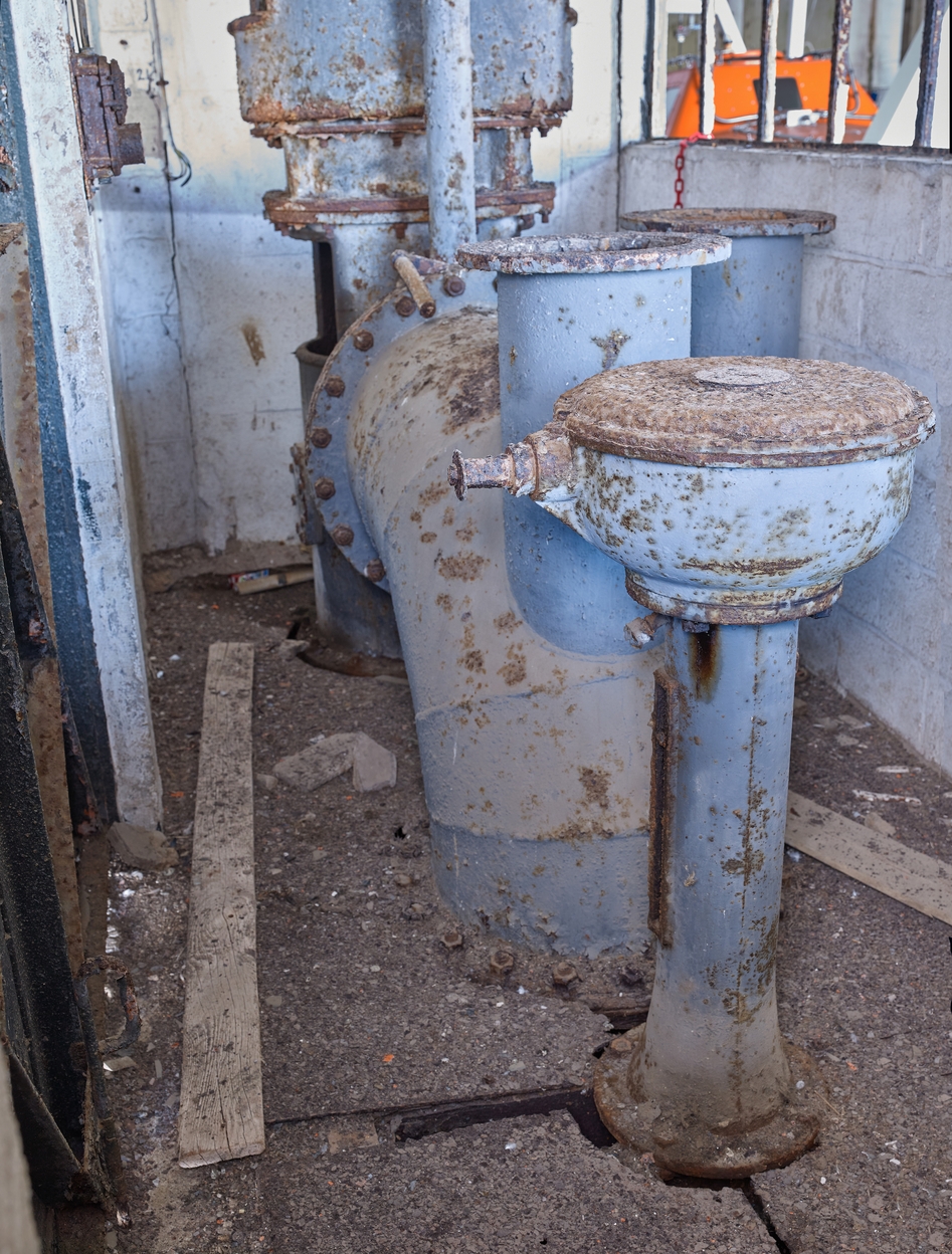 Vue de la salle des pompes située entre les alvéoles D (n° 19, 19a et 20) et E (n° 17 et 18) : l'un des tuyaux a été déposéImmatriculation