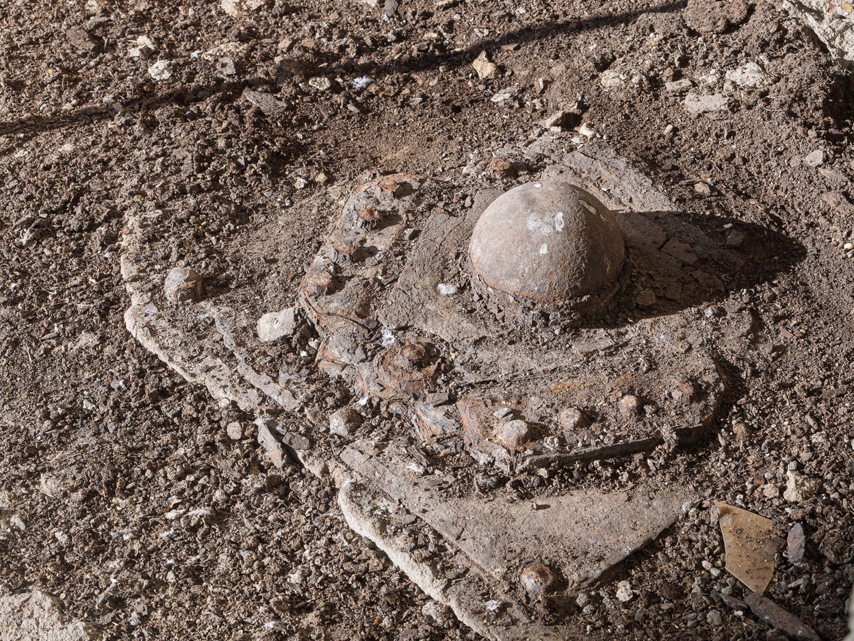 Vue de l'entrée de l'alvéole E (n° 17 et 18) : rotule métallique d'emboitement qui permet la rotation de la porte blindée de l'alvéoleImmatriculation