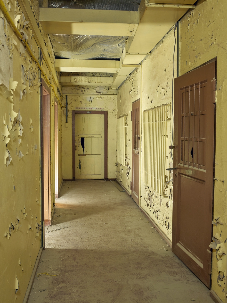 Vue du couloir du troisième étage de la nef n° 3 desservant des bureaux (en 1945). Les deux bureaux situés à droite ont été transformés en cellule (porte et fenêtre barreautés)Immatriculation