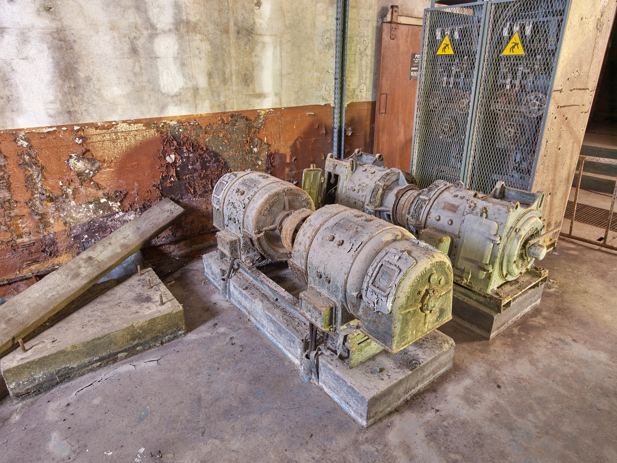 Vue de la salle des groupes électrogènes diesel : ensemble de deux machines à courant continu de la Compagnie générale électrique NancyImmatriculation