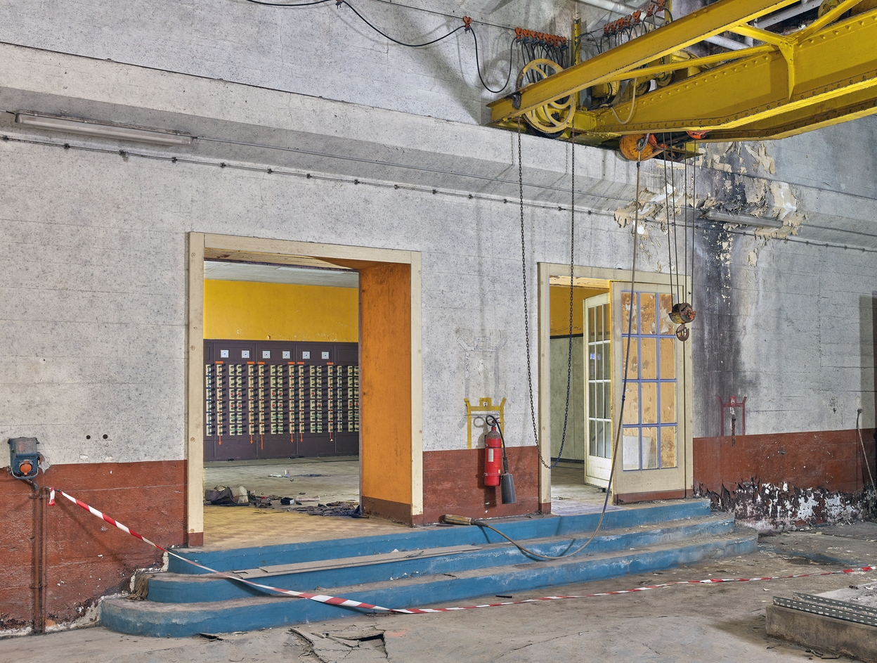Vue des portes précédées d'un perron donnant accès à la centrale électrique depuis la salle des groupes électrogènes diesel. En haut à droite, le pont roulant d'une capacité de 5 tonnes de la salle des groupes électrogènesImmatriculation