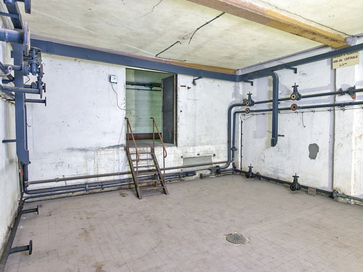 Vue du deuxième étage : "réserve à gas-oil" : 24 m3 (fonction de 1966). Les traces des cuves circulaires sont visibles sur le carrelage. Sur le panneau à droite, on peut lire "Caisses de réserve / Gas-oil centrale / 4 x 3 m3"Immatriculation