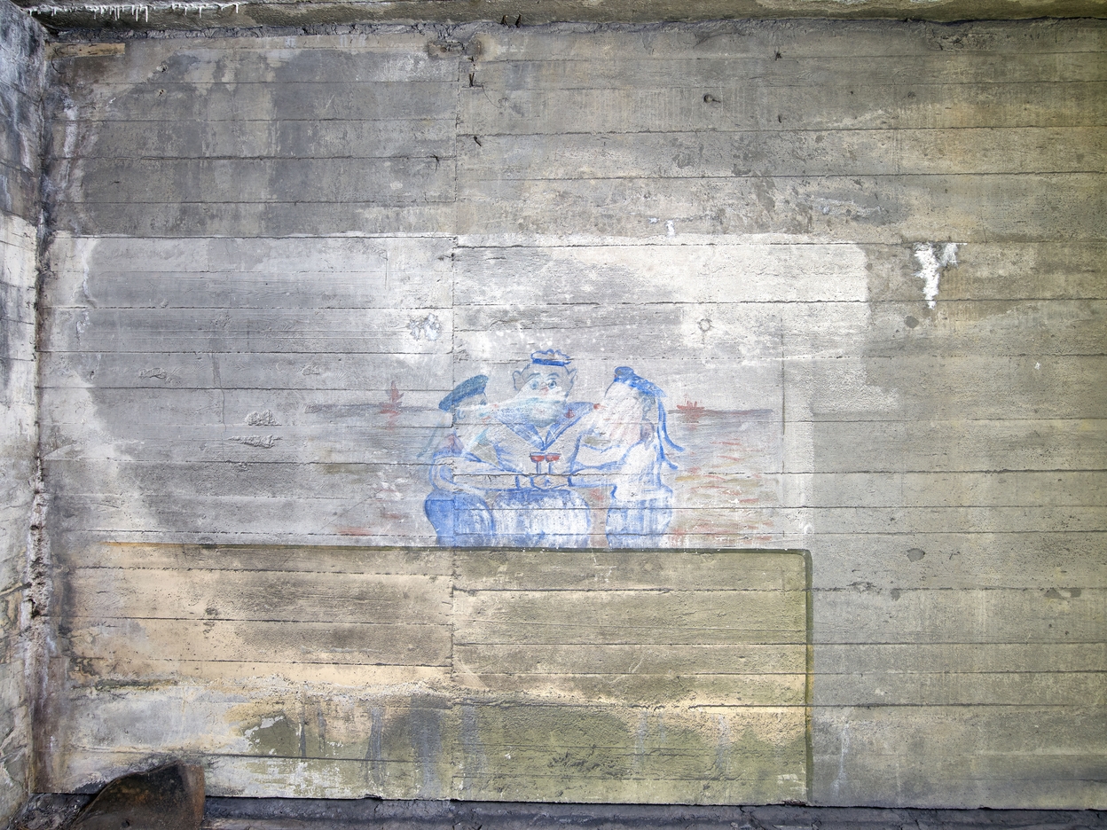 Vue du deuxième étage de l'extension sud : salle de pause, peinture murale d'origine allemande. Scène de boisson entre trois marins allemands sur fond de paysage marin avec la mer et un navire de part et d'autre (peinture à dominante bleue)Immatriculation