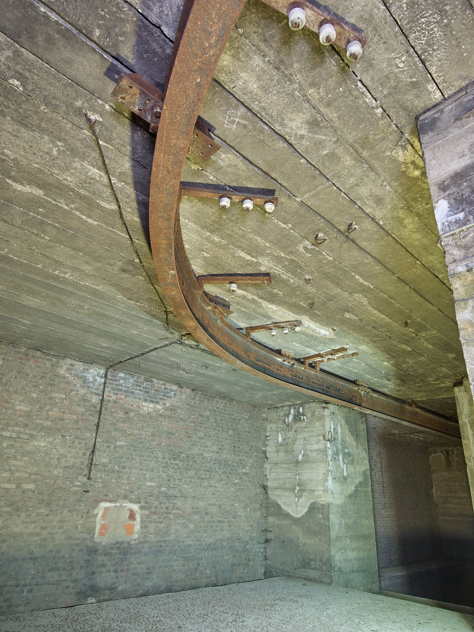 Vue du deuxième étage de l'extension sud : couloir d'accès aux trémies à charbon, monorail avec son système d'alimentation électrique triphasée. Au fond, les trois trémiesImmatriculation