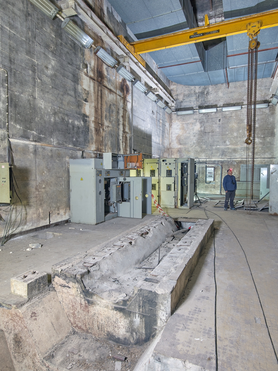 Vue générale de la chaufferie (fonction en 1945) avec son pont roulant. Le pont roulant d'une capacité de 10 tonnes est de marque "FENWICK" (PB2-78). Au premier plan, l'emplacement d'une machine. Sur les murs, plafonnier rectangulaire de type néonImmatriculation