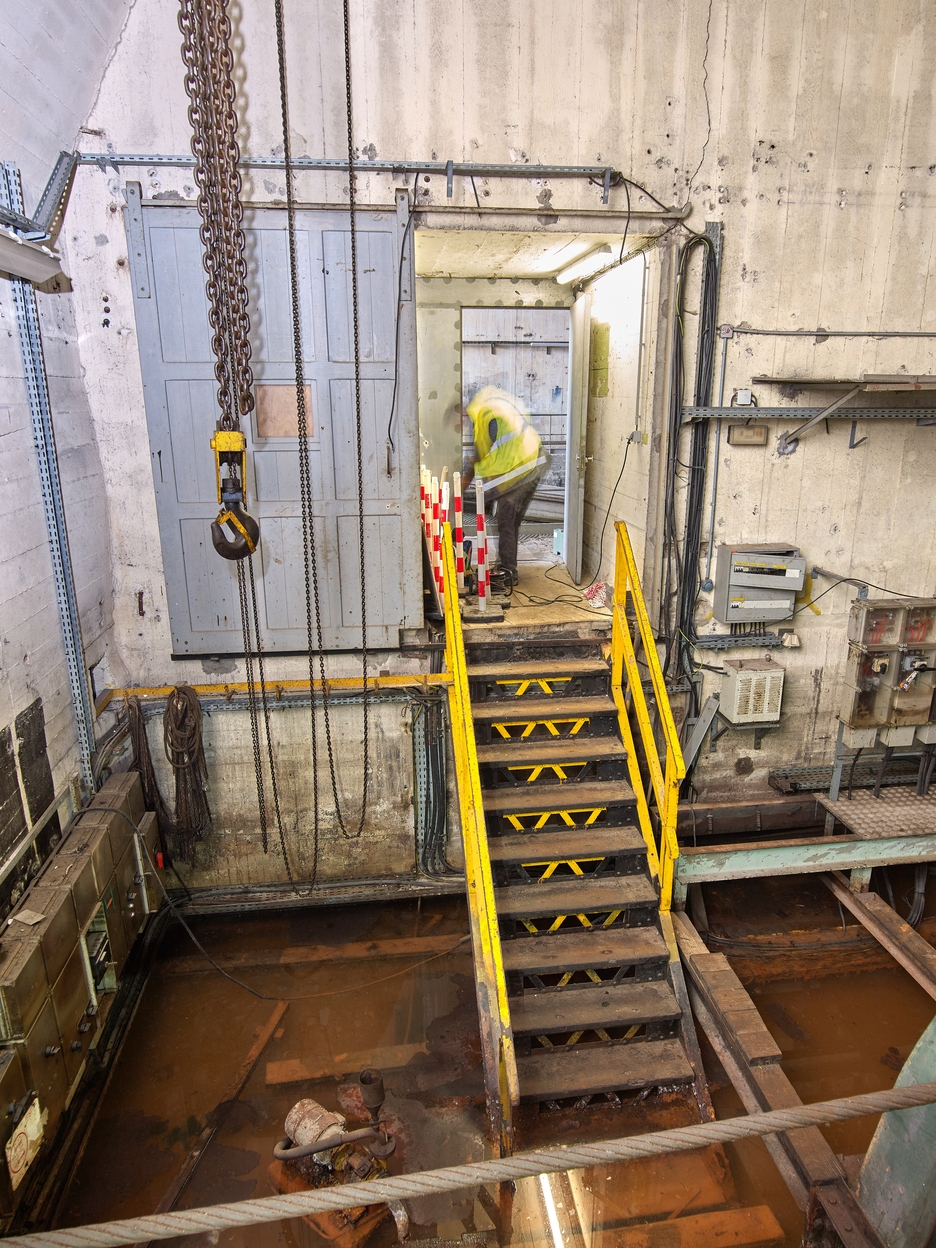 Vue de l'accès à la salle du treuil depuis l'alvéole du slipway (porte coulissante)Immatriculation