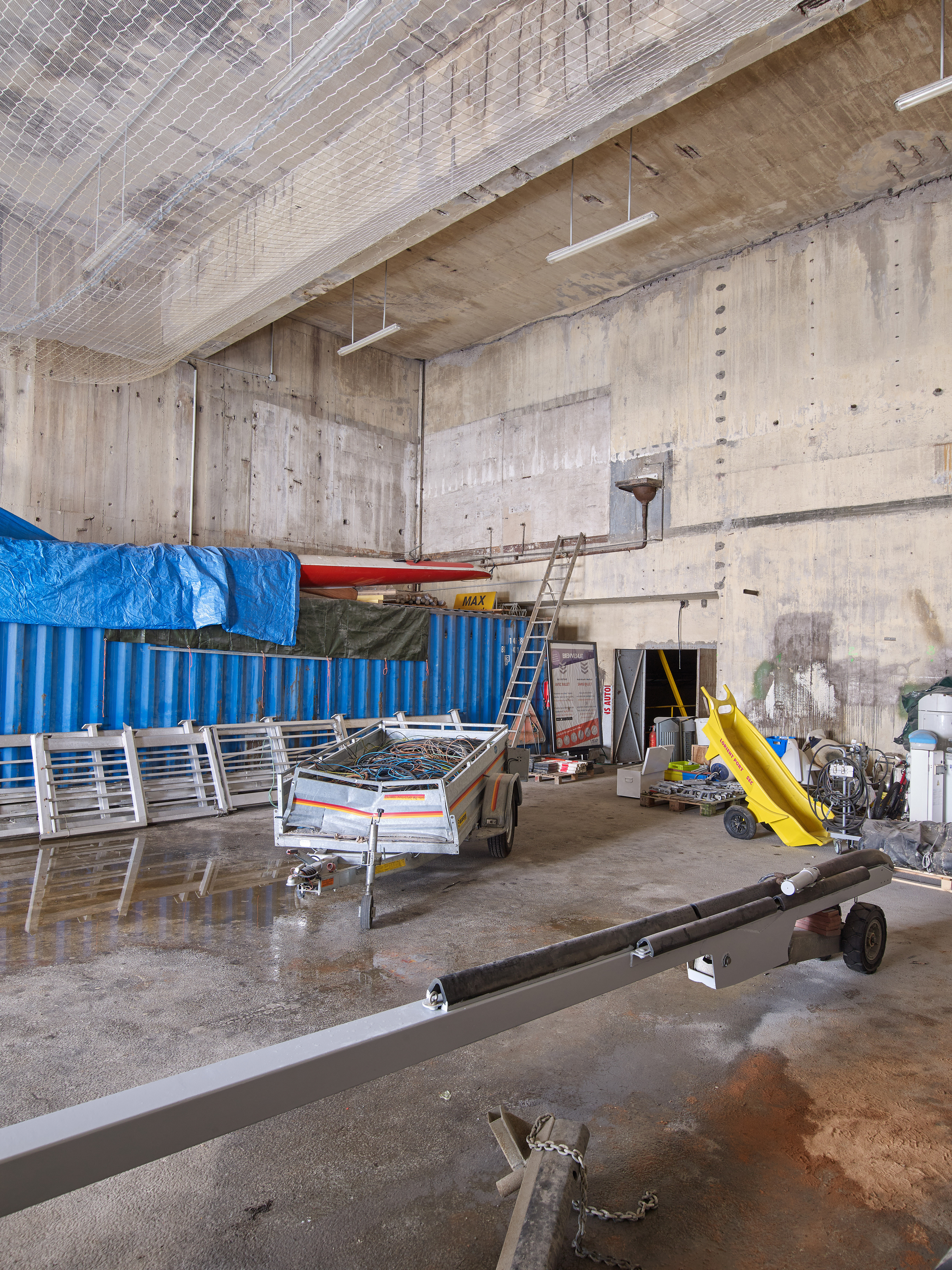 Vue la chaudronnerie devenue atelier du Port à sec : accroché au mur, un lavabo de la période allemande témoigne de la présence d'un étageImmatriculation