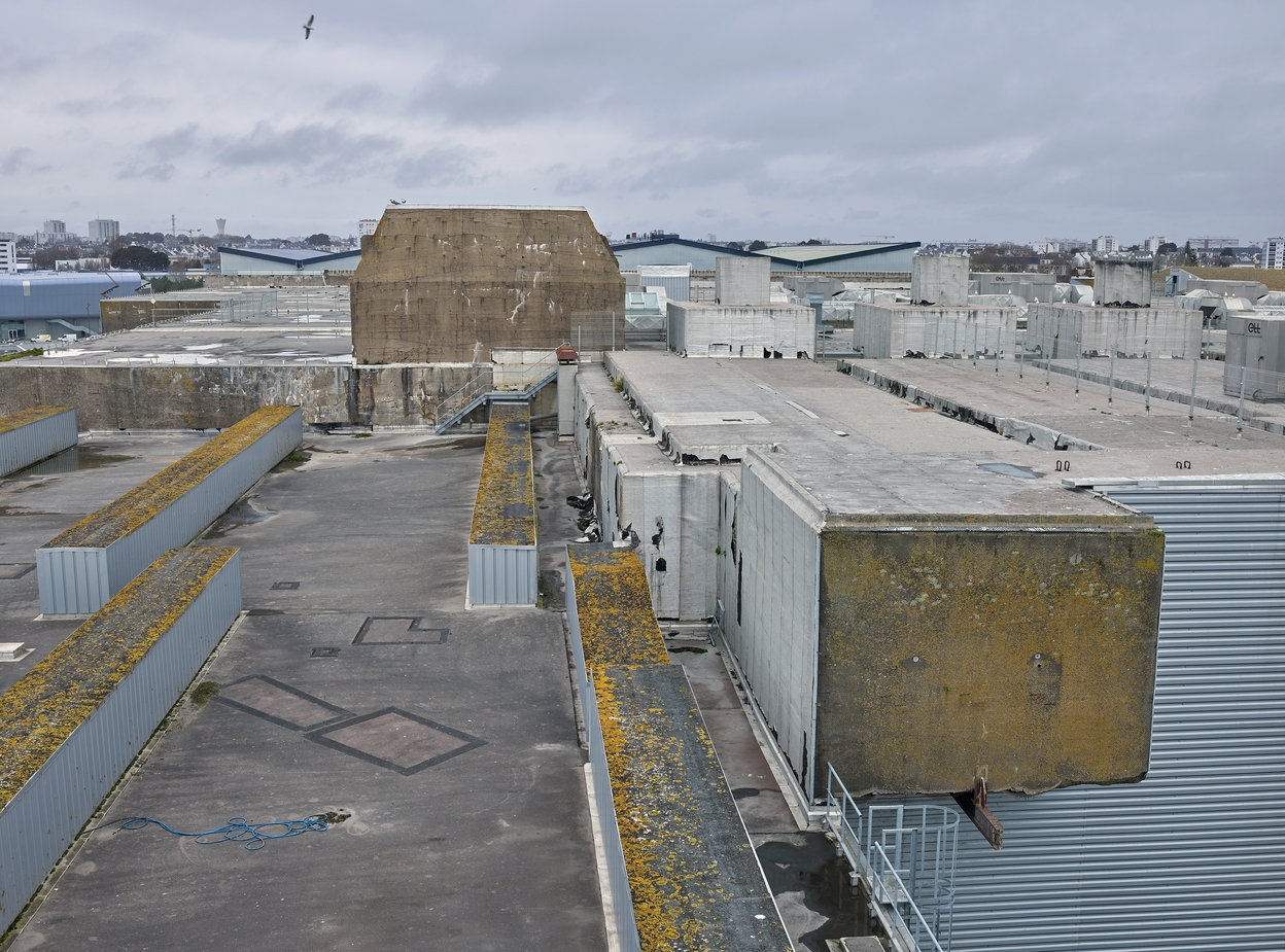 Vue de la dalle de couverture du bunker Keroman I. Au centre, bunker - cuve pour un canon antiaérien quadruple de 2 cm et abri. A droite au premier plan, accès des trémies à charbon (masqué par le bardage) avec son monorail pour le chargement depuis le parc à charbonImmatriculation