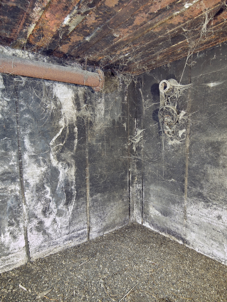 Vue intérieure : pièce de vie - chambrée ; dans le mur, conduit de cheminée du poêle et conduit de ramonage (fermé par un couvercle boulonné). Des toiles d'araignée ont envahi le bunker. Au sol, des fientes d'oiseauImmatriculation