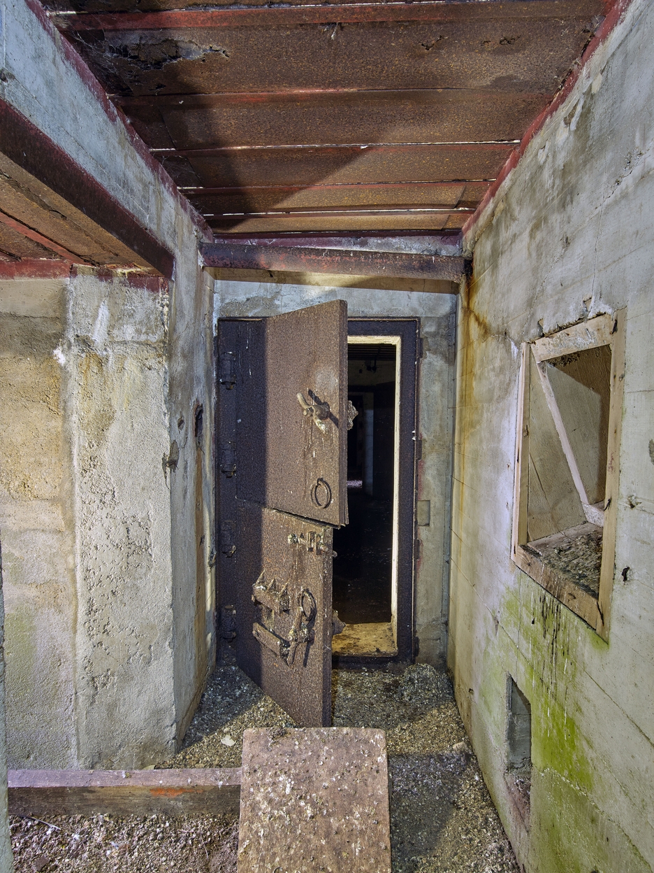 Vue intérieure : porte blindée à deux vantaux du sas. A gauche : couloir d'entrée ouest ; à droite : créneau de défenseImmatriculation
