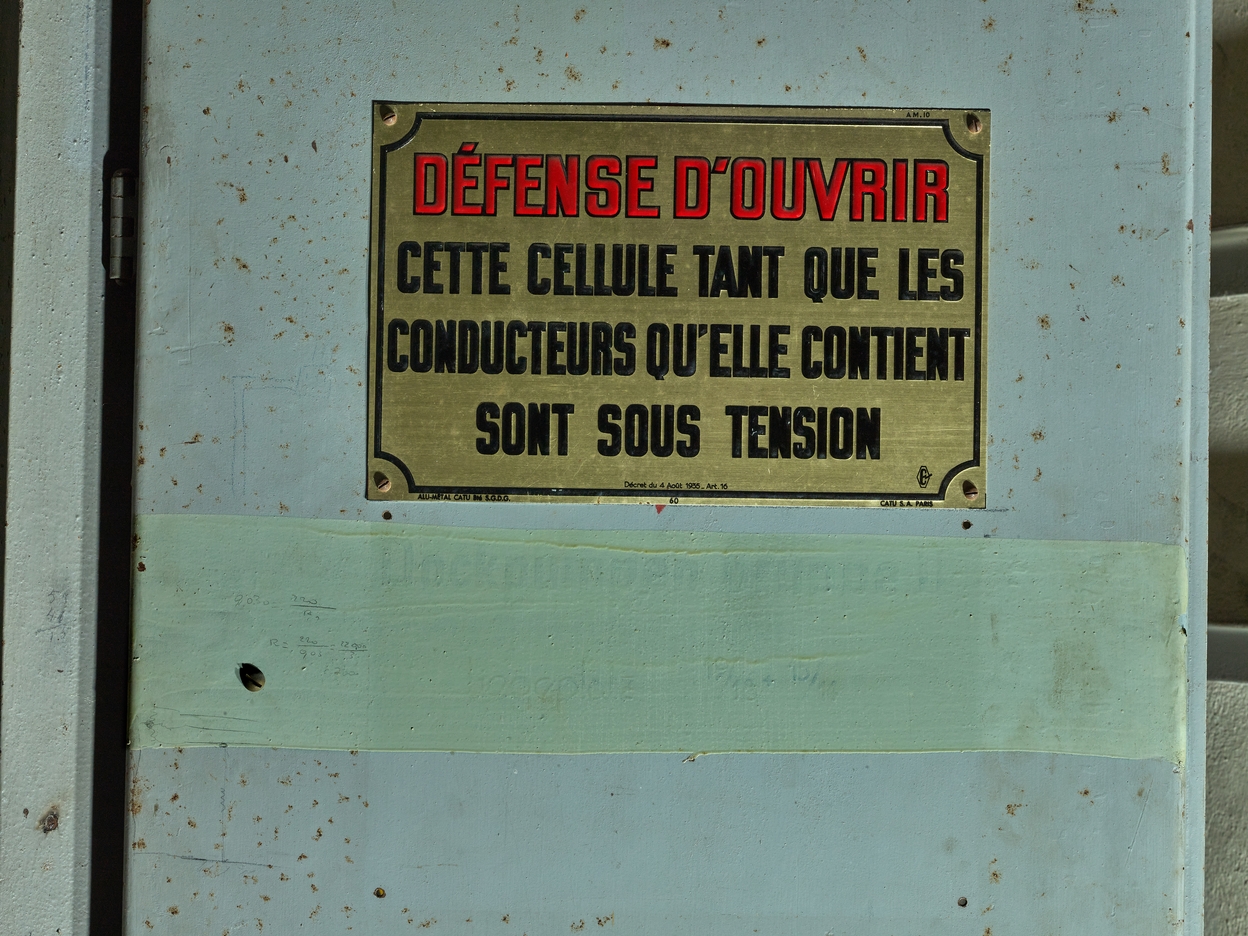 Vue de l'une des cellules hautes-tensions situées au deuxième étage : cellule n° 22, plaque signalétique et inscription en allemand (repeinte en gris) Dockpumpen Gruppe (pompes de quai)Immatriculation