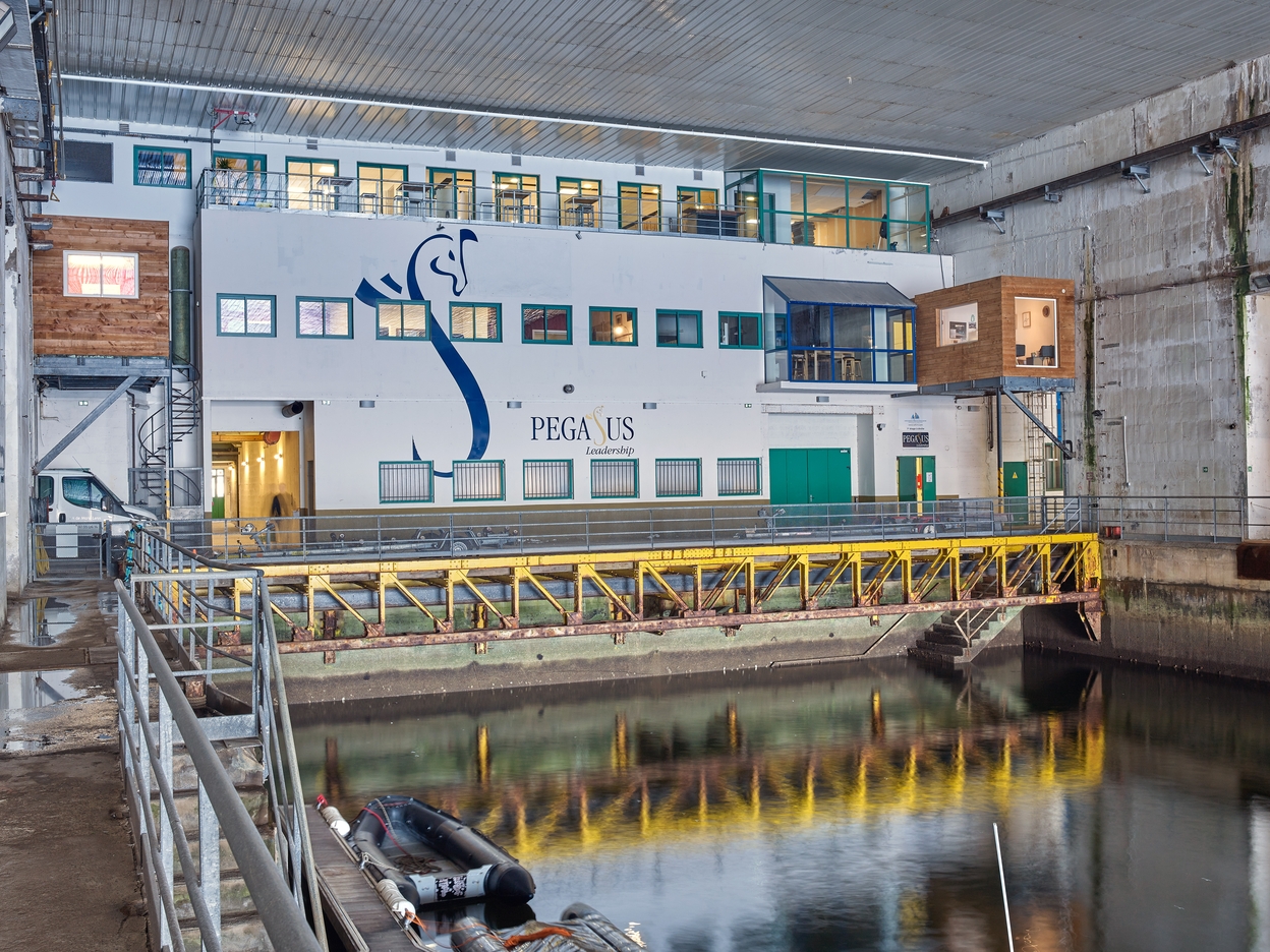 Vue du fond de l'alvéole depuis le quai (bassin abritant les emplacements 19, 19a et 20). Dans les anciens ateliers, est installée l'entreprise Pegasus LeadershipImmatriculation