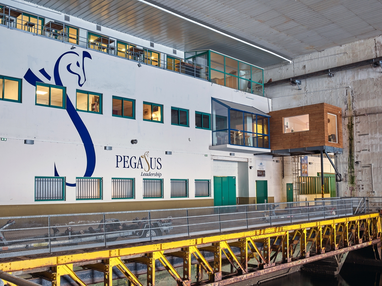 Vue du fond de l'alvéole depuis le quai (bassin abritant les emplacements 19, 19a et 20). Dans les anciens ateliers, est installée l'entreprise Pegasus LeadershipImmatriculation