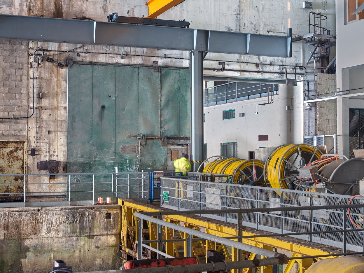 Vue de la porte coulissante située entre les alvéoles B et C avec son système d'ouverture par treuil. Elle est également dotée d'une porte piétonne. Sur la porte, on peut lire : NEFS CLIMATISEES REFERMEZ CETTE PORTE APRES VOTRE PASSAGEImmatriculation
