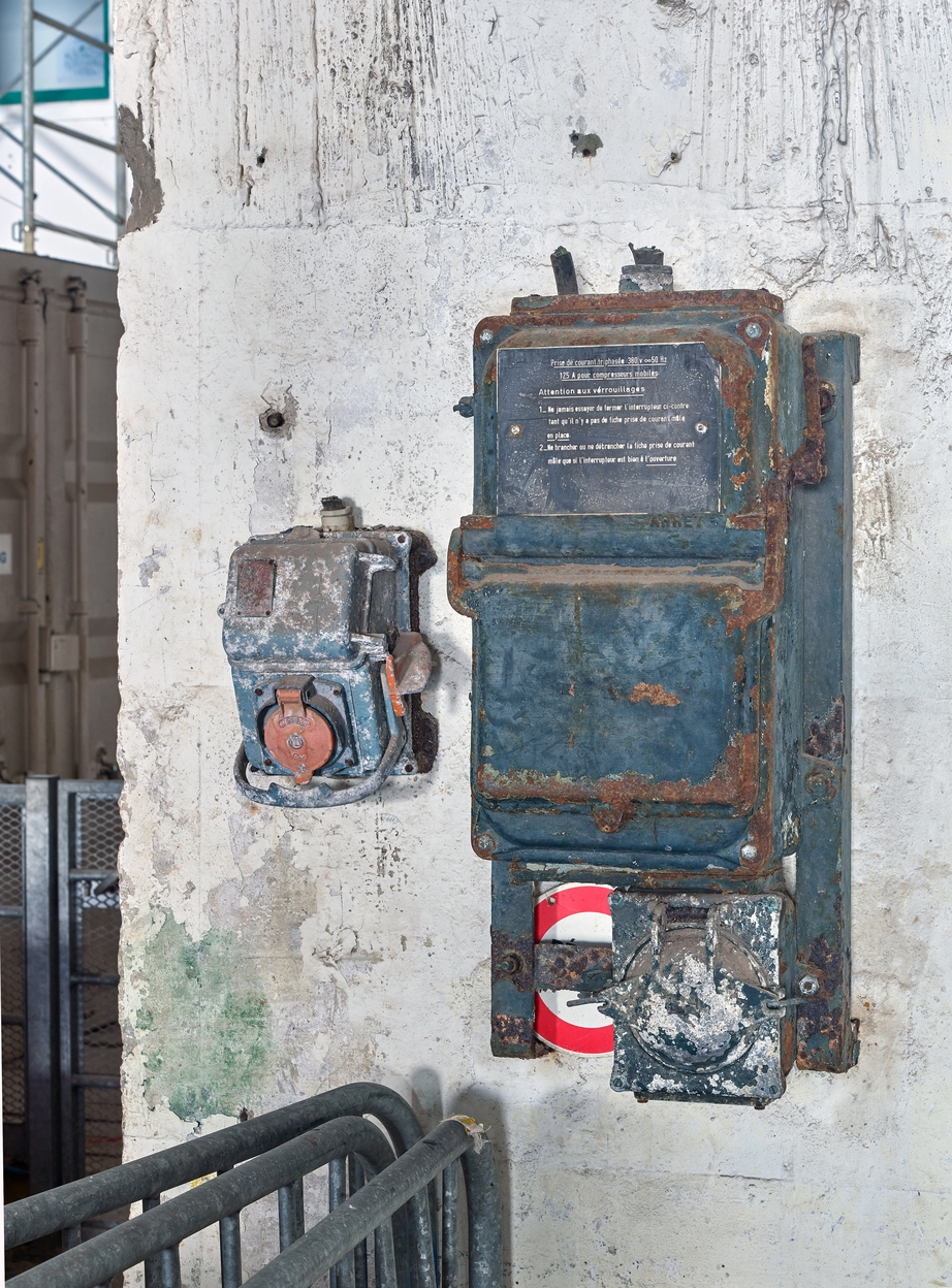 Vue de deux boîtiers électriques. A droite, un boîter de prise de courant triphasée. Sur le boîtier : informations (380 v 50 Hz 125 A pour compresseurs mobiles) et consignes de sécuritéImmatriculation